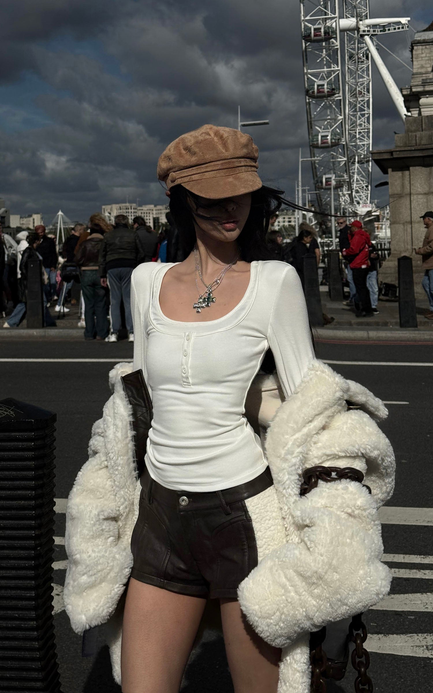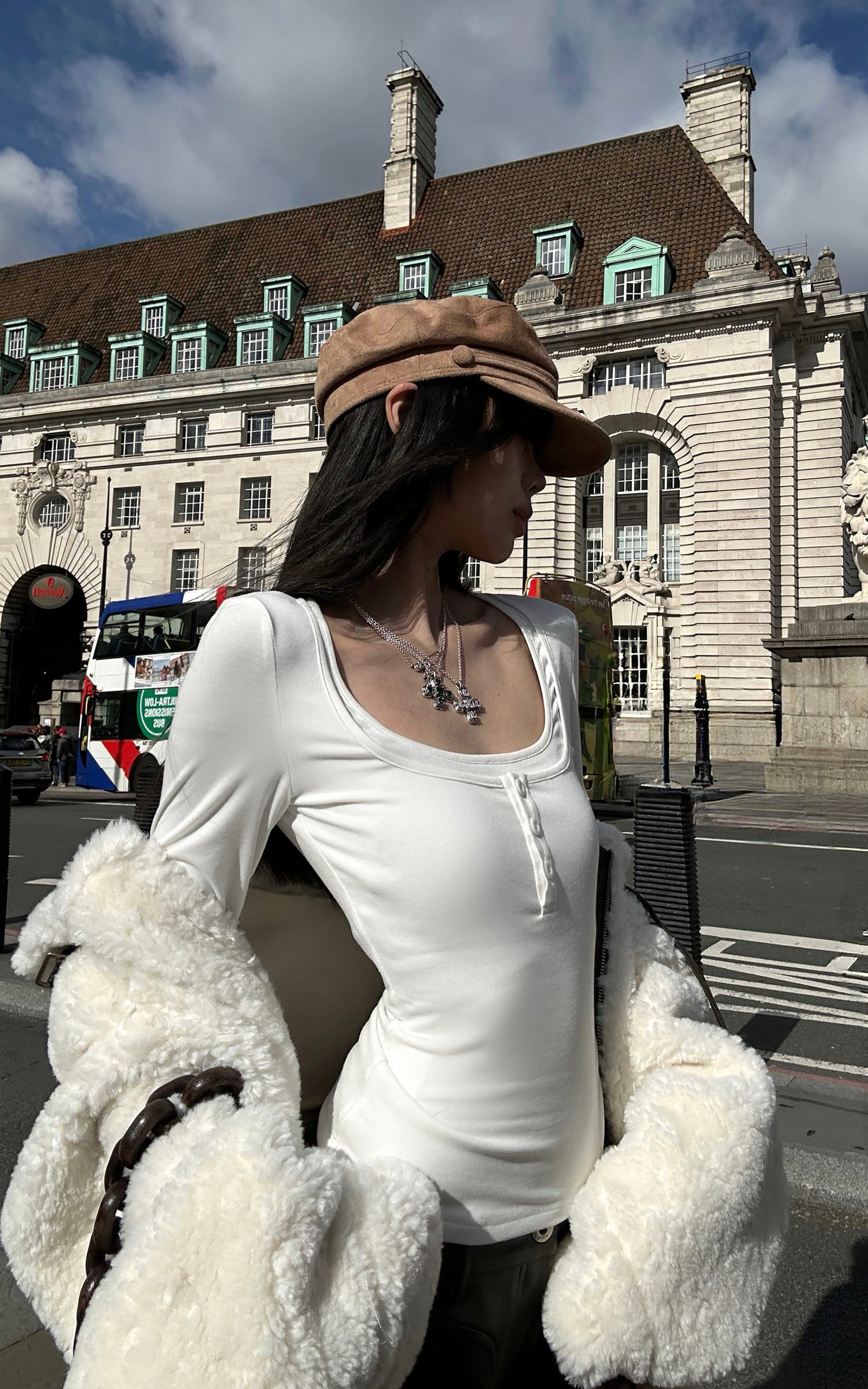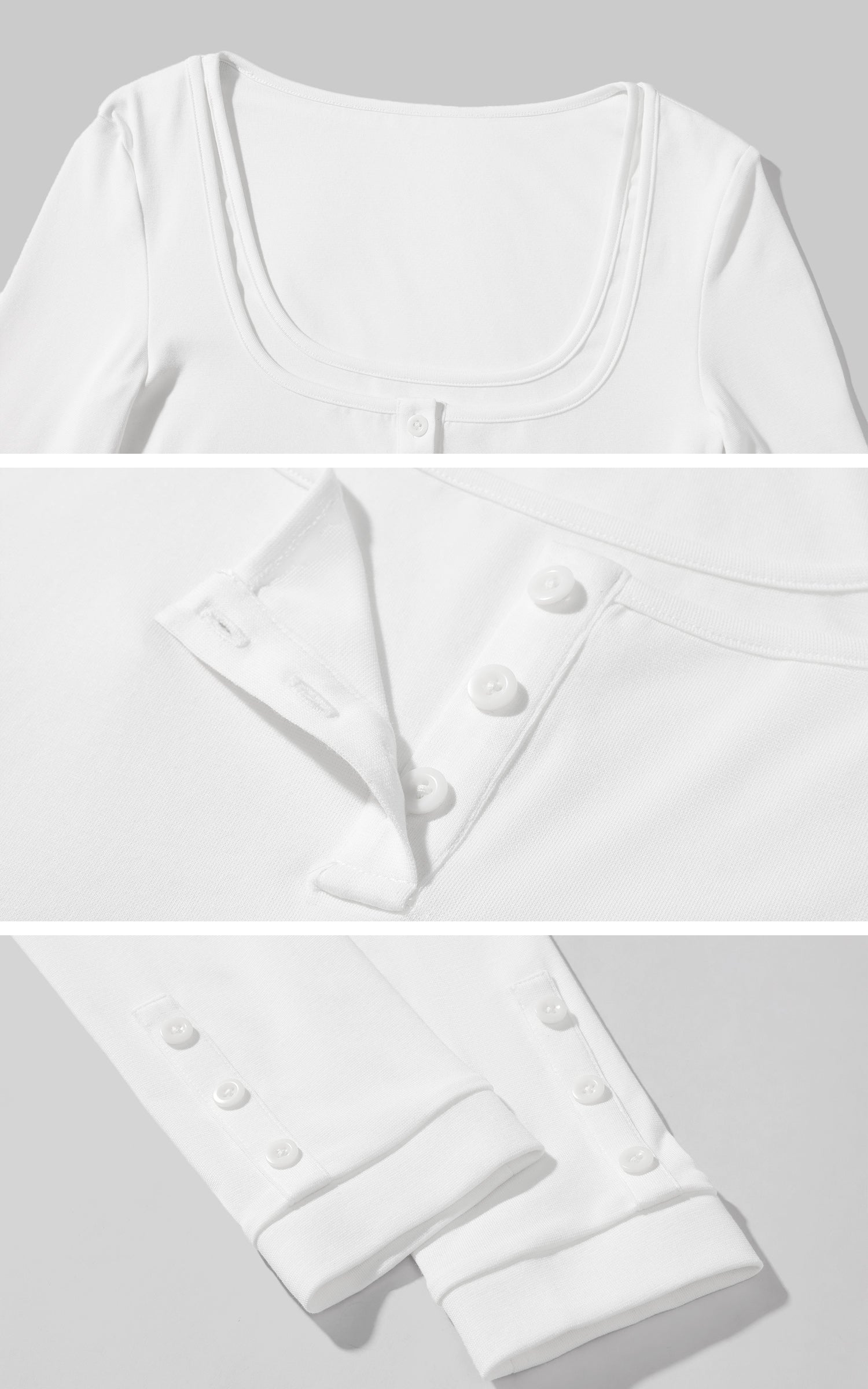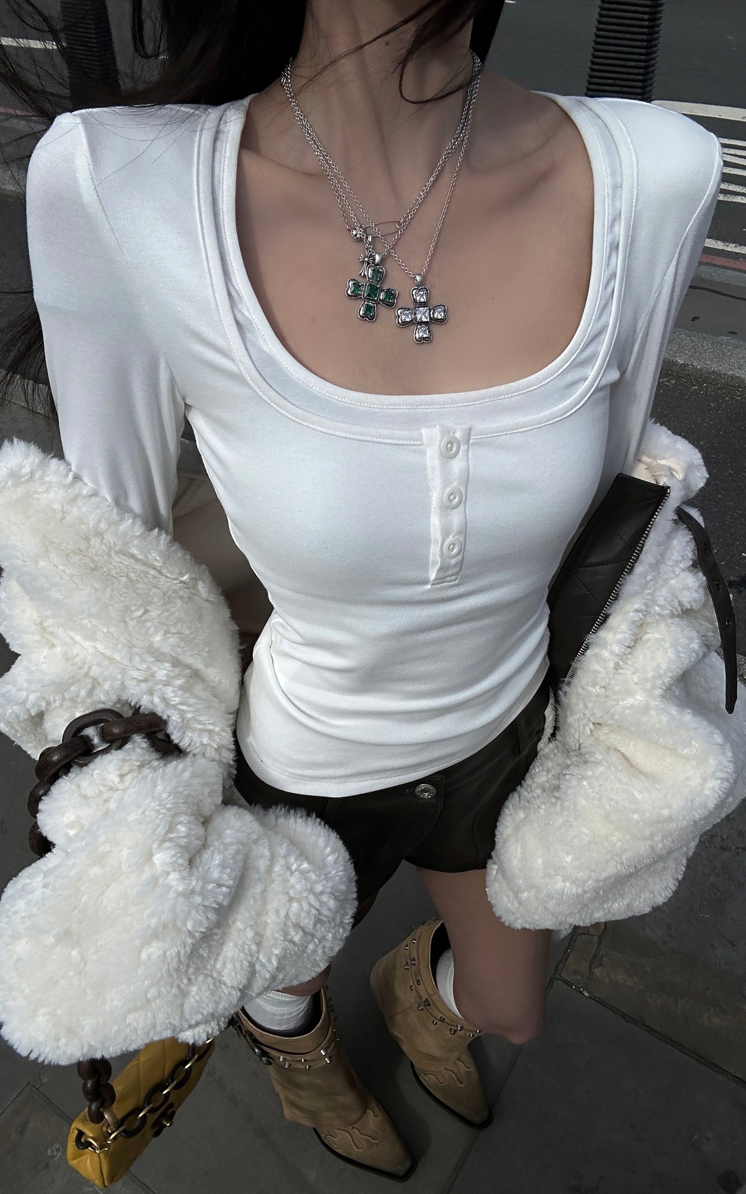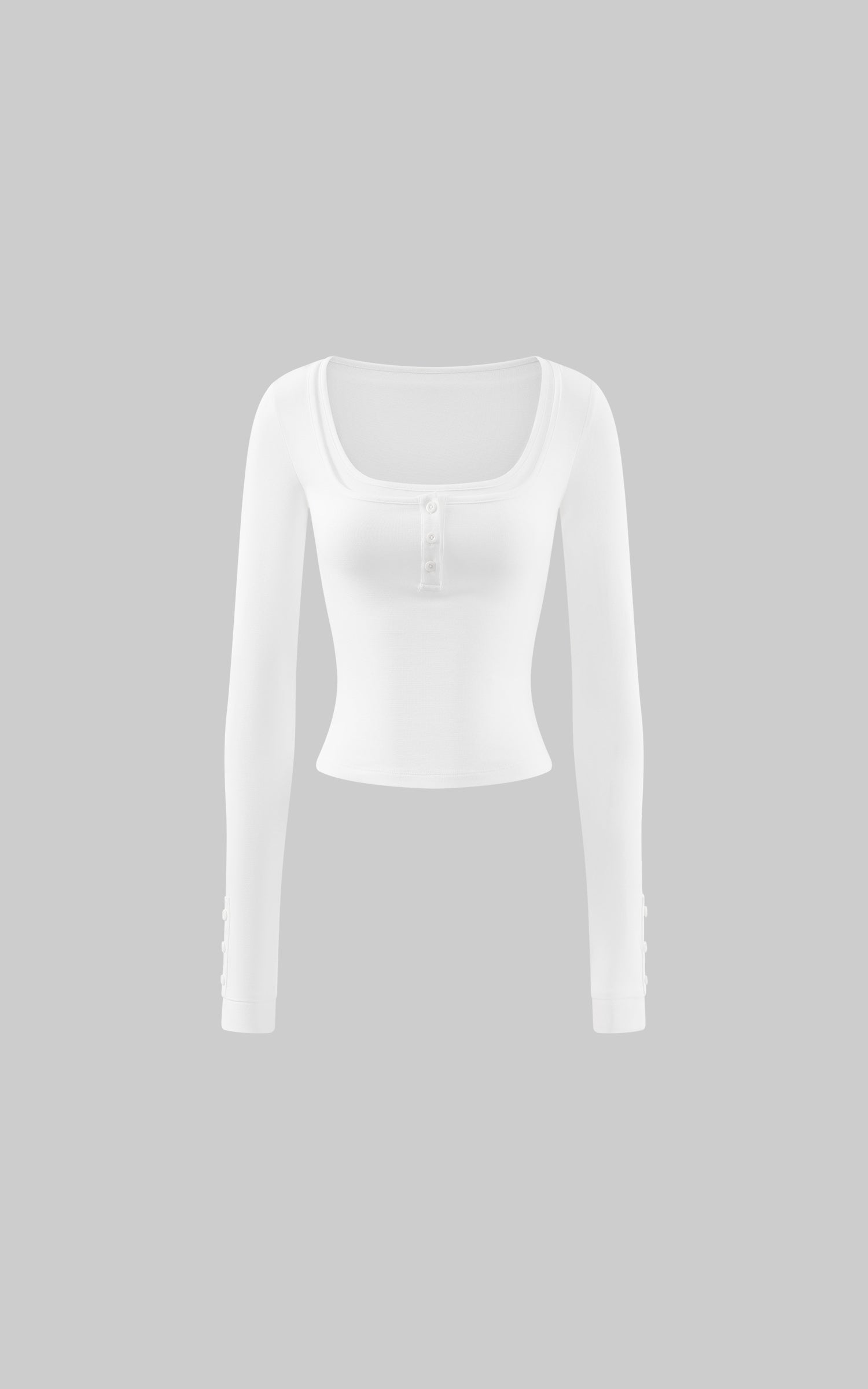 WARDEN EDGE レイヤード効果のロングスリーブトップ スクエアネック ボタンディテールTシャツ