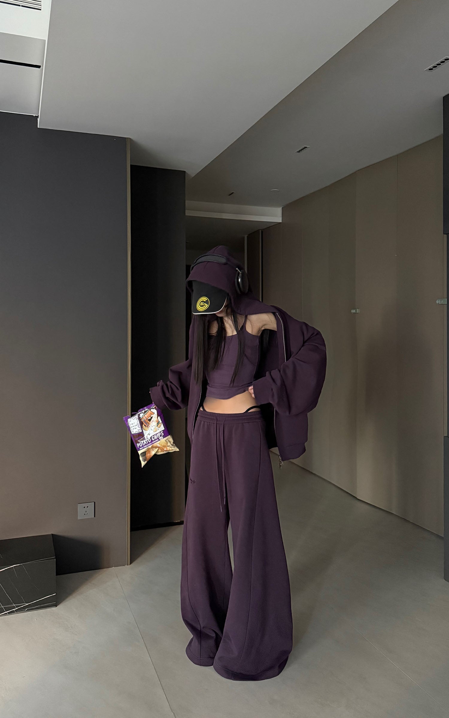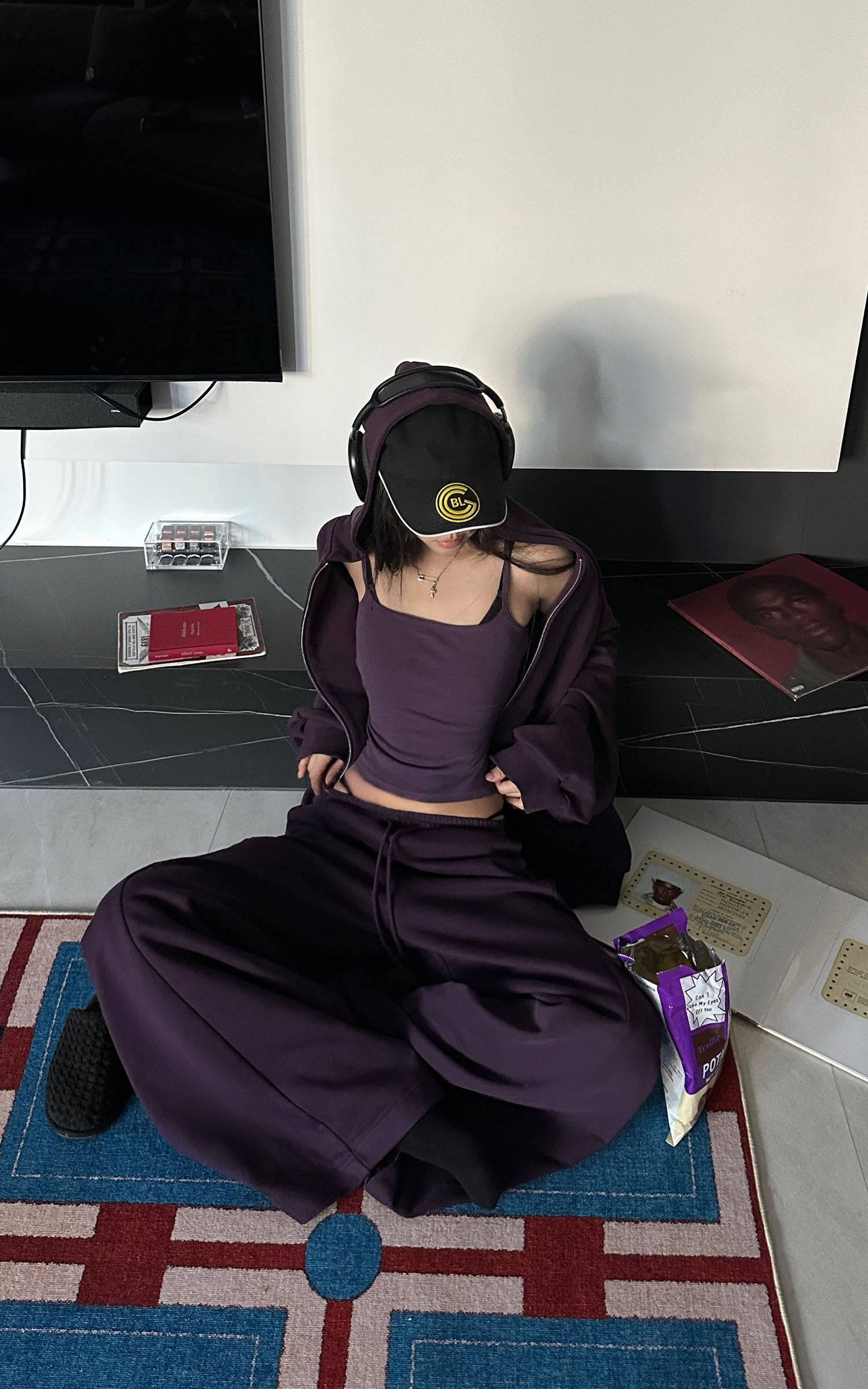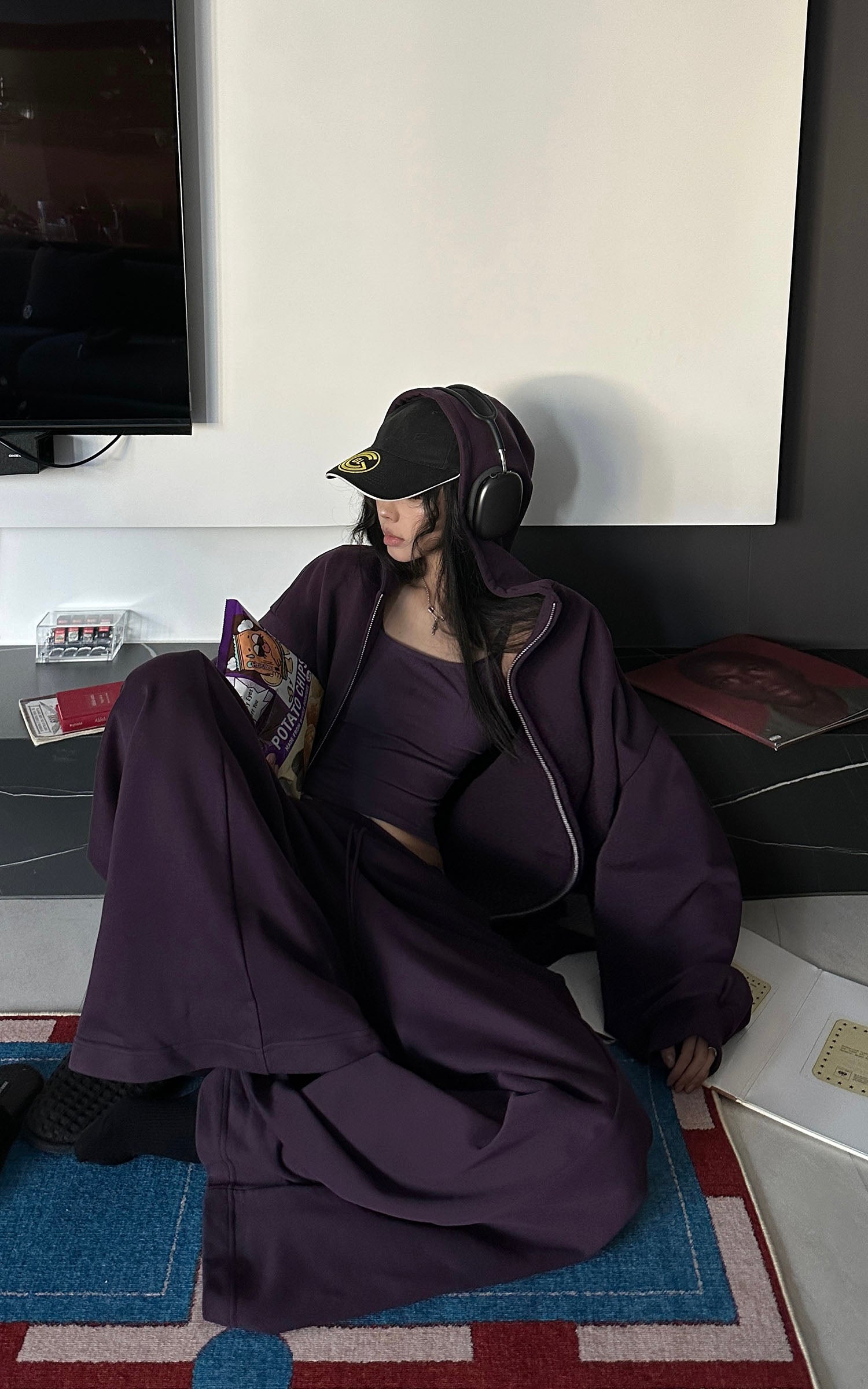 WARDEN EDGE フード付きジップジャケット、ワイドレッグパンツ、フィットしたキャミソールの3点セット