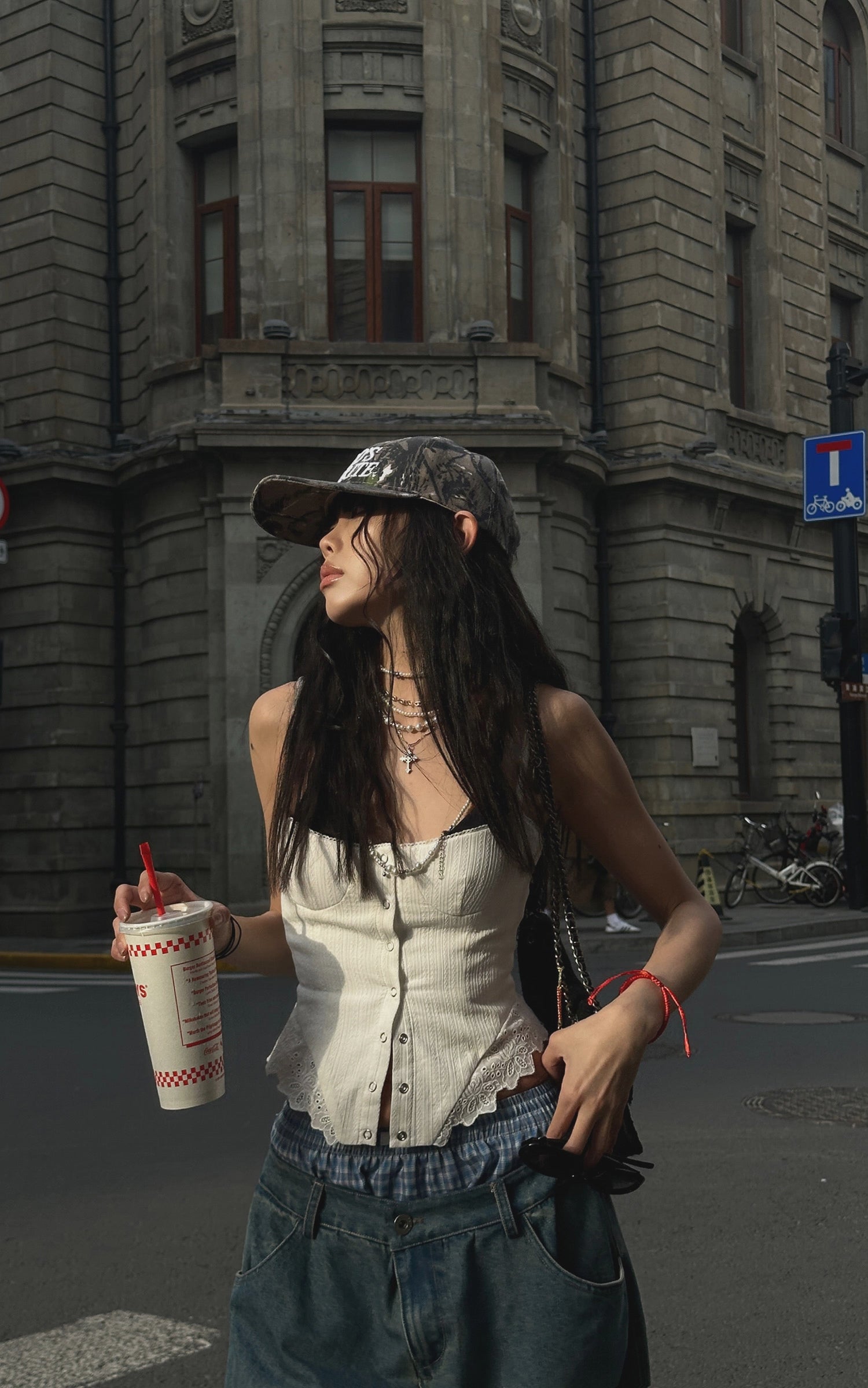 WARDEN EDGE レースの裾付き白いコルセットトップ