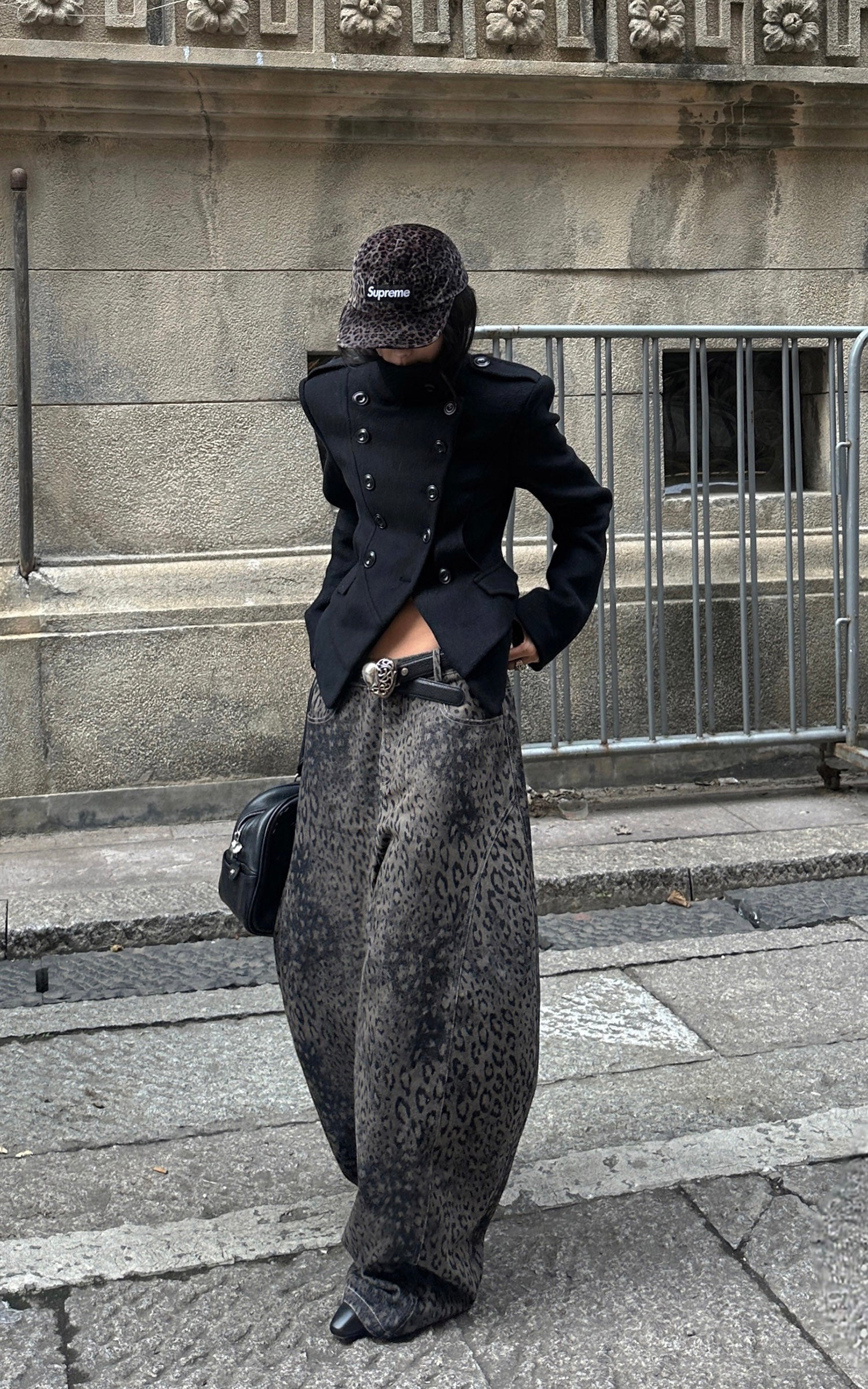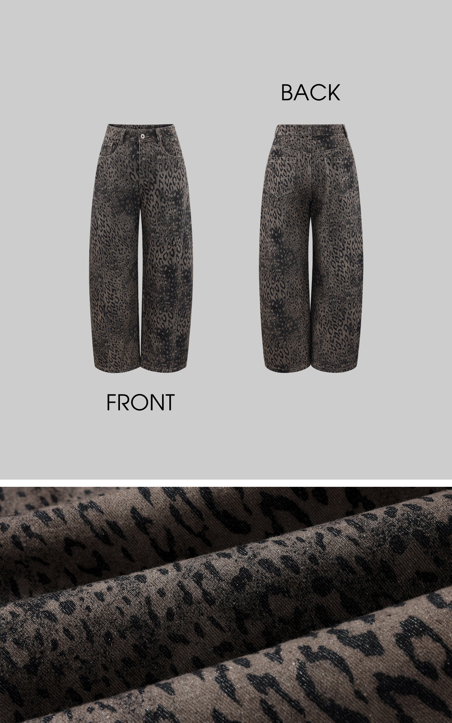 WARDEN EDGE レオパードプリントのダメージ加工ワイドレッグデニムパンツ