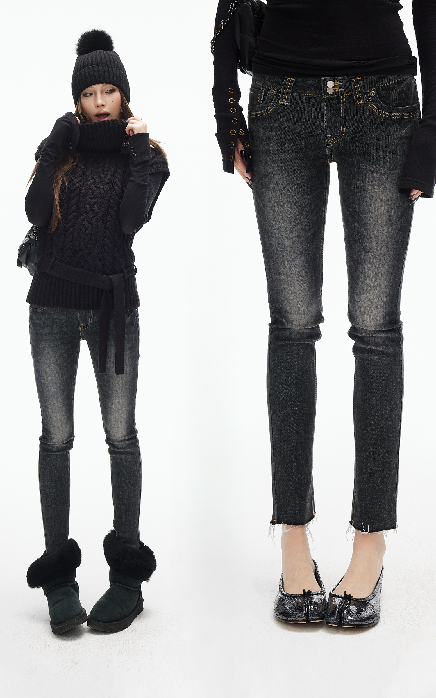 IAMXIAA ヴィンテージウォッシュスキニージーンズ、ラフヘムとコントラストステッチ付き