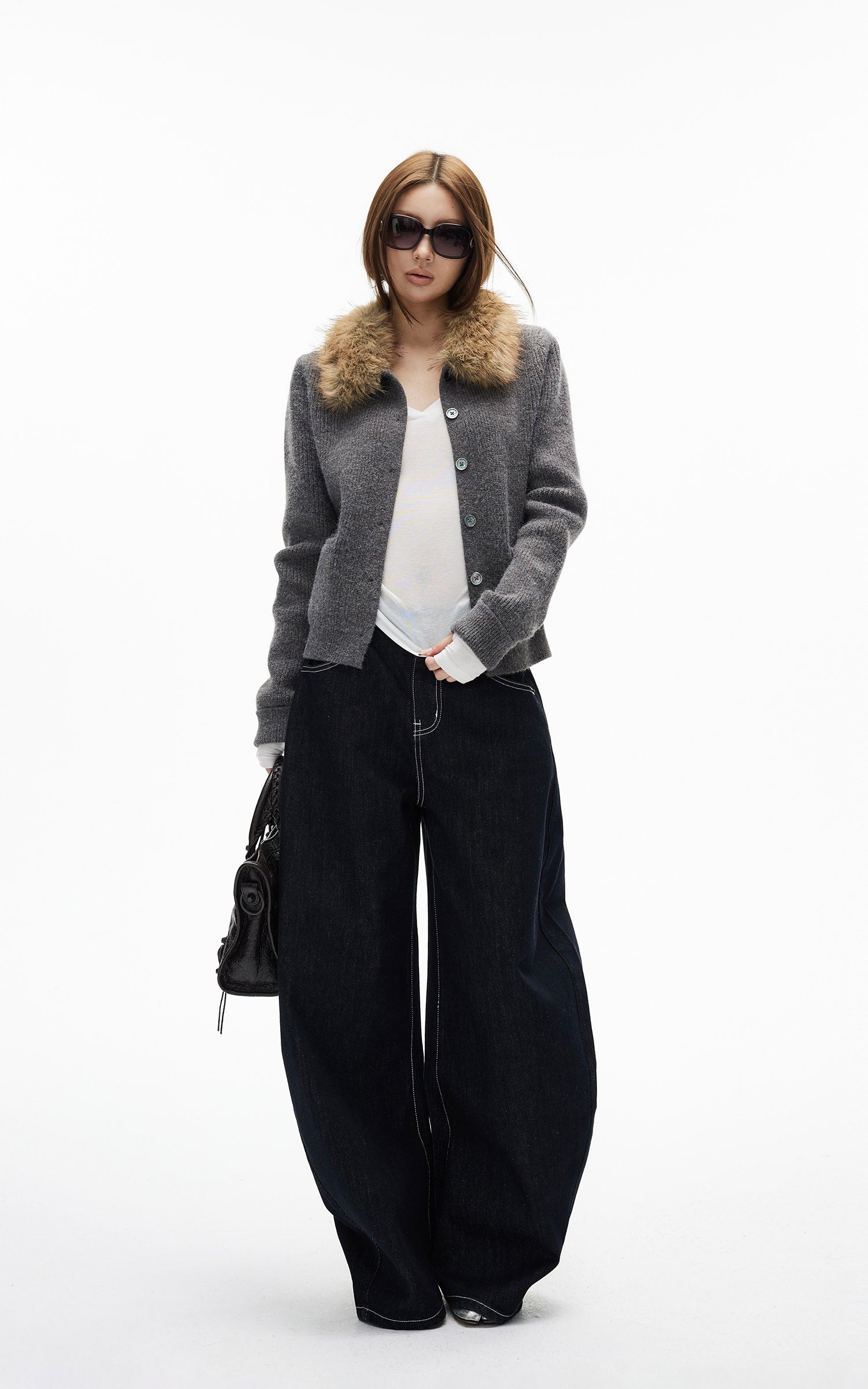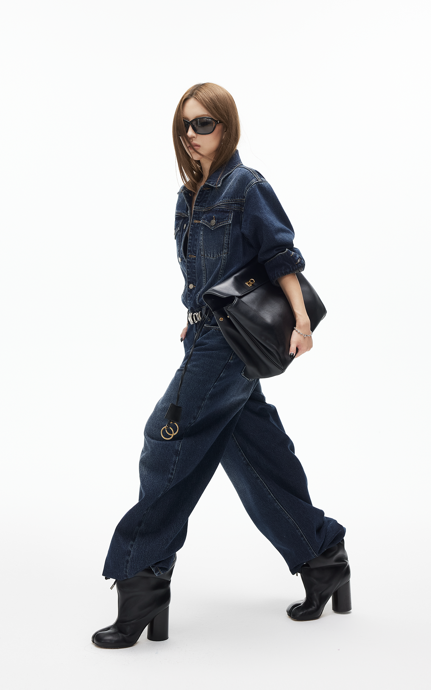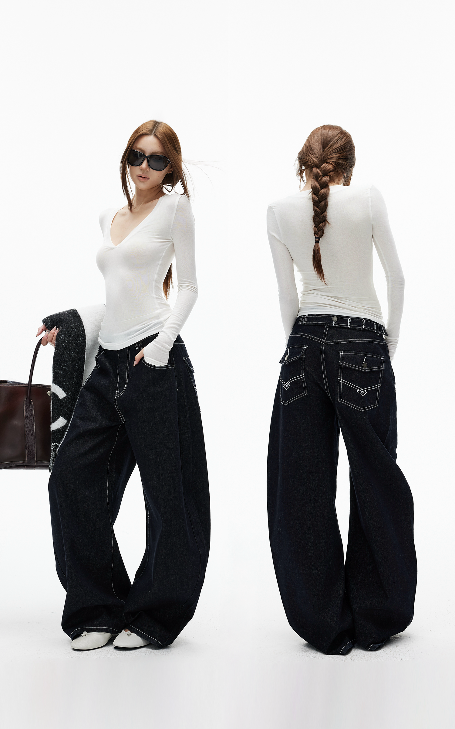 IAMXIAA ダブルバックポケット付きコントラストステッチワイドレッグデニムジーンズ