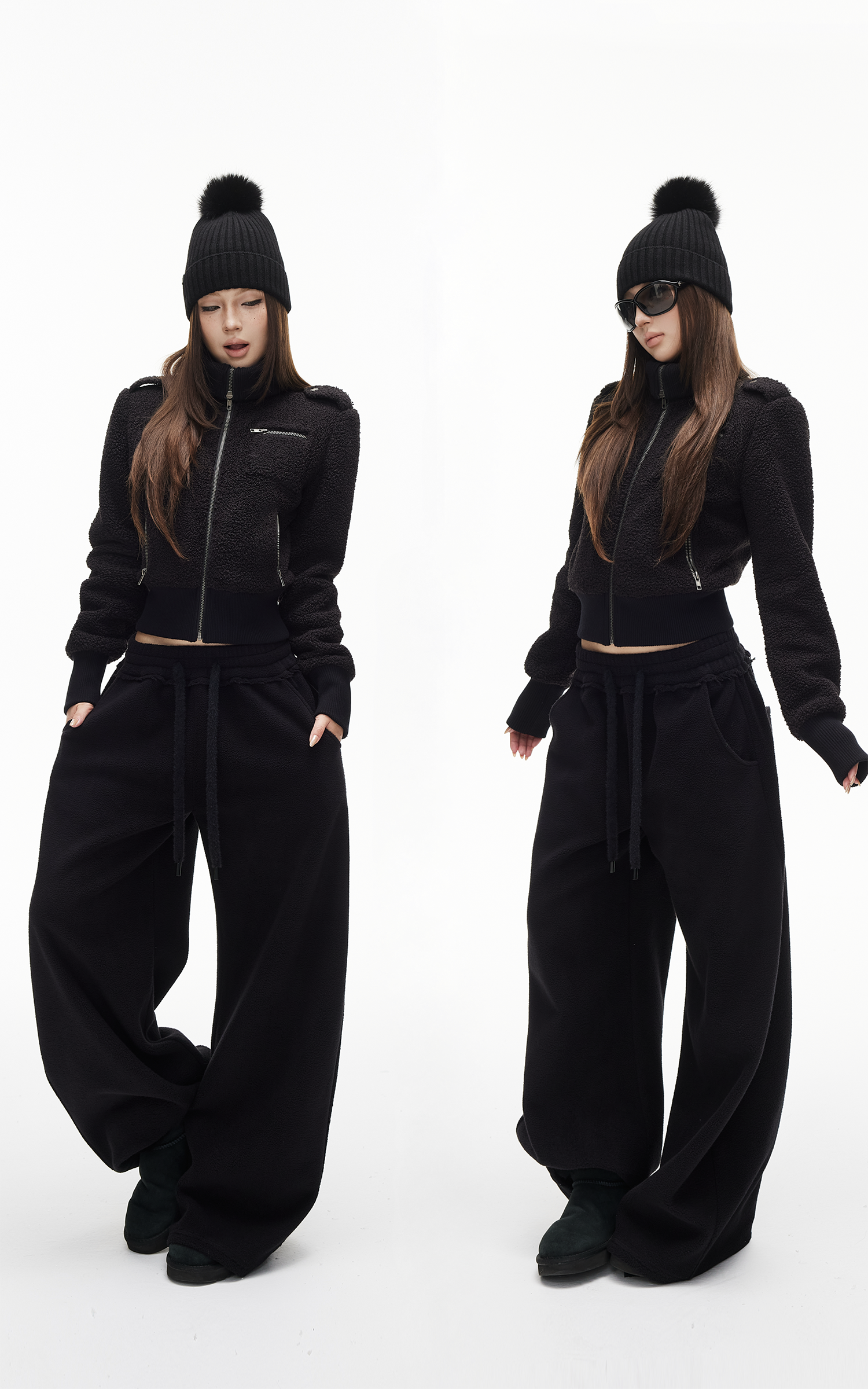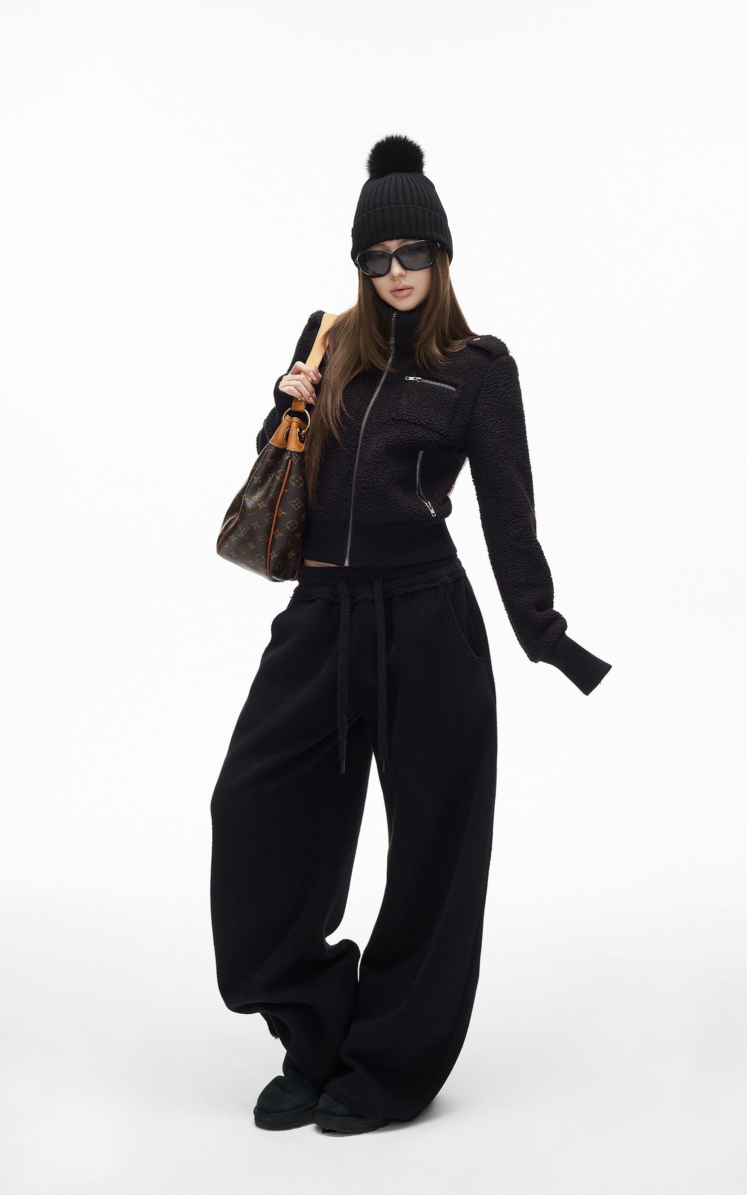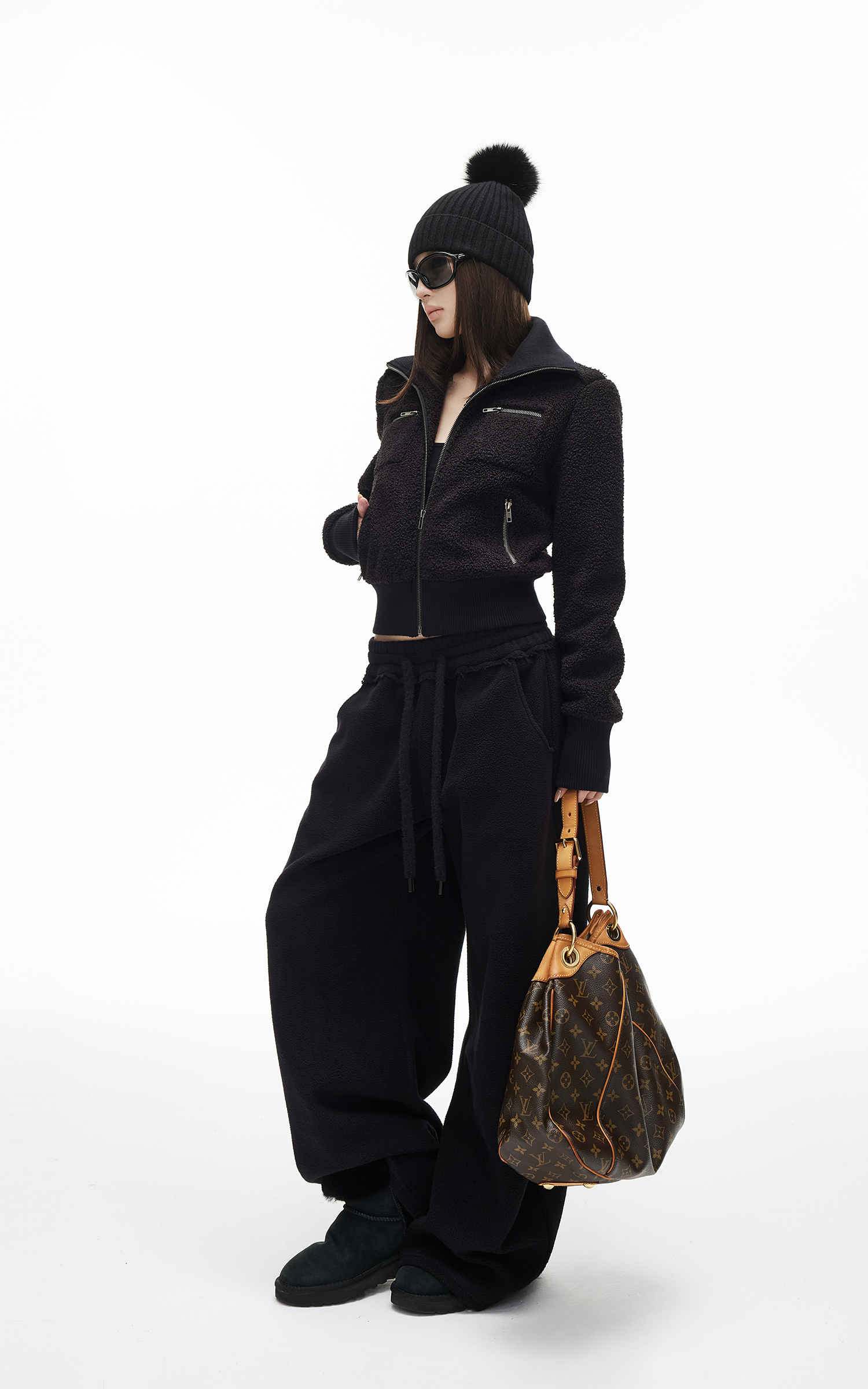IAMXIAA フェイクファー トリム フーディ ジップ ジャケット & ワイドレッグ スウェットパンツ セット