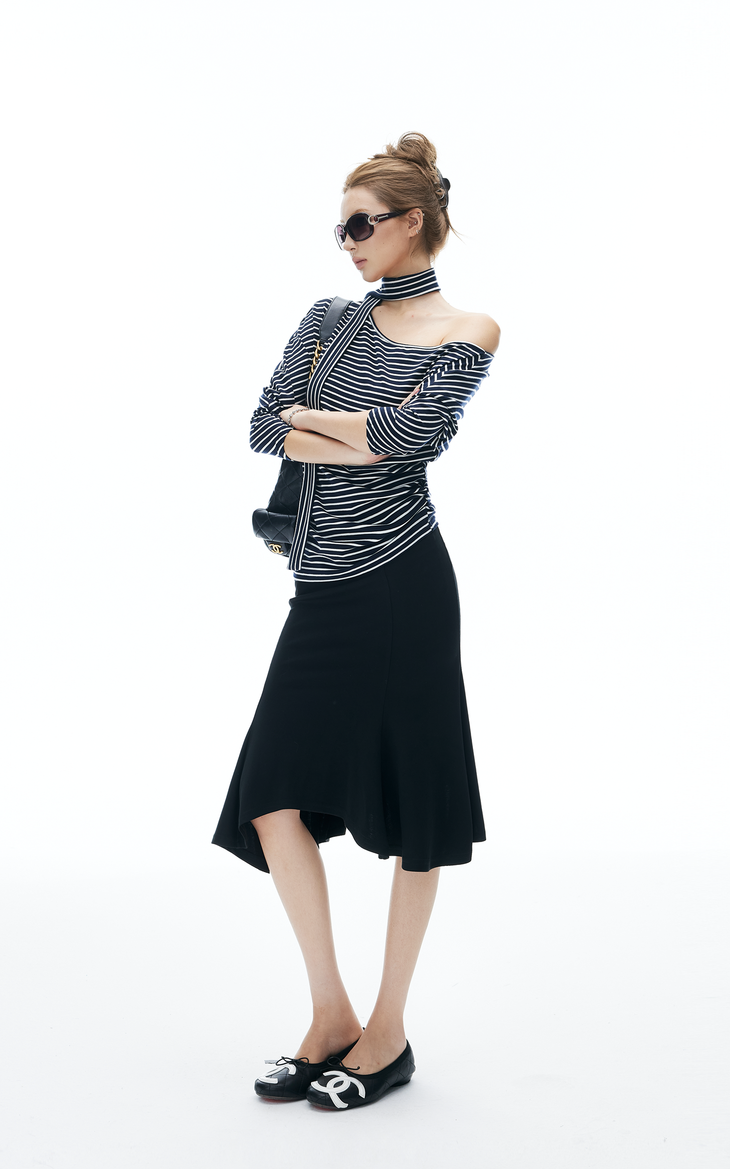 IAMXIAA アシンメトリーヘム ミディスカート フェミニン スリムフィット フレアデザイン