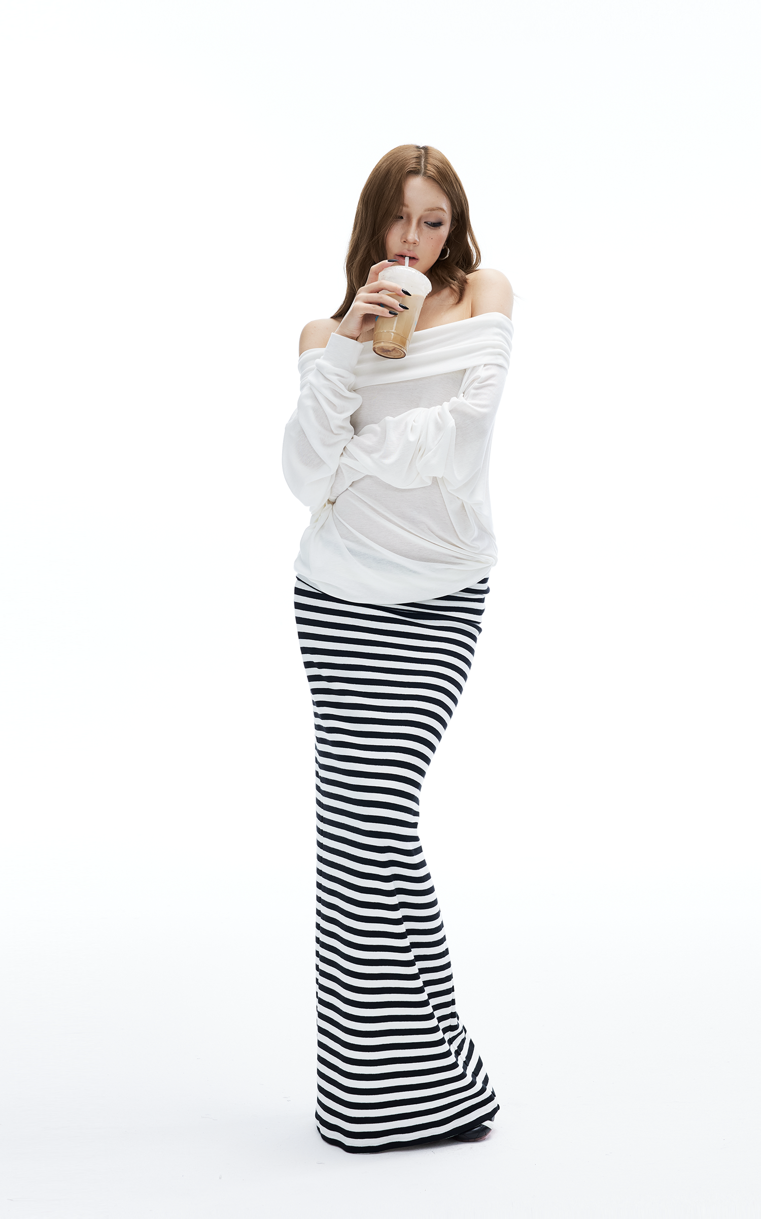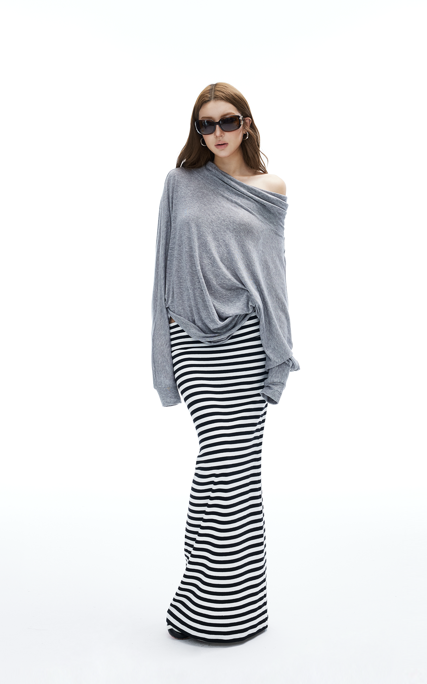 IAMXIAA ストライプ柄ボディコンマキシスカート スリムフィット ストレッチロングスカート