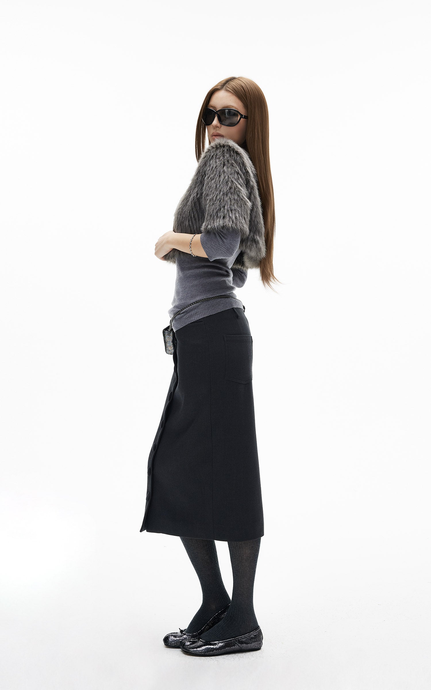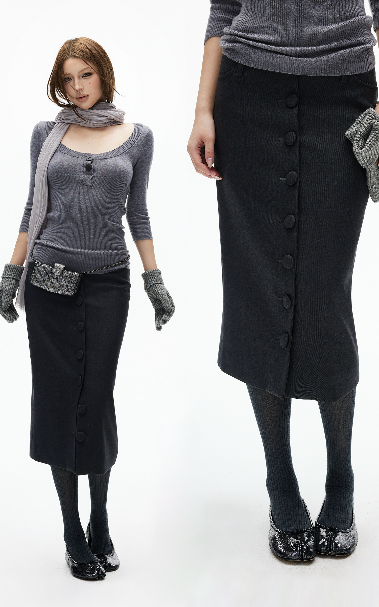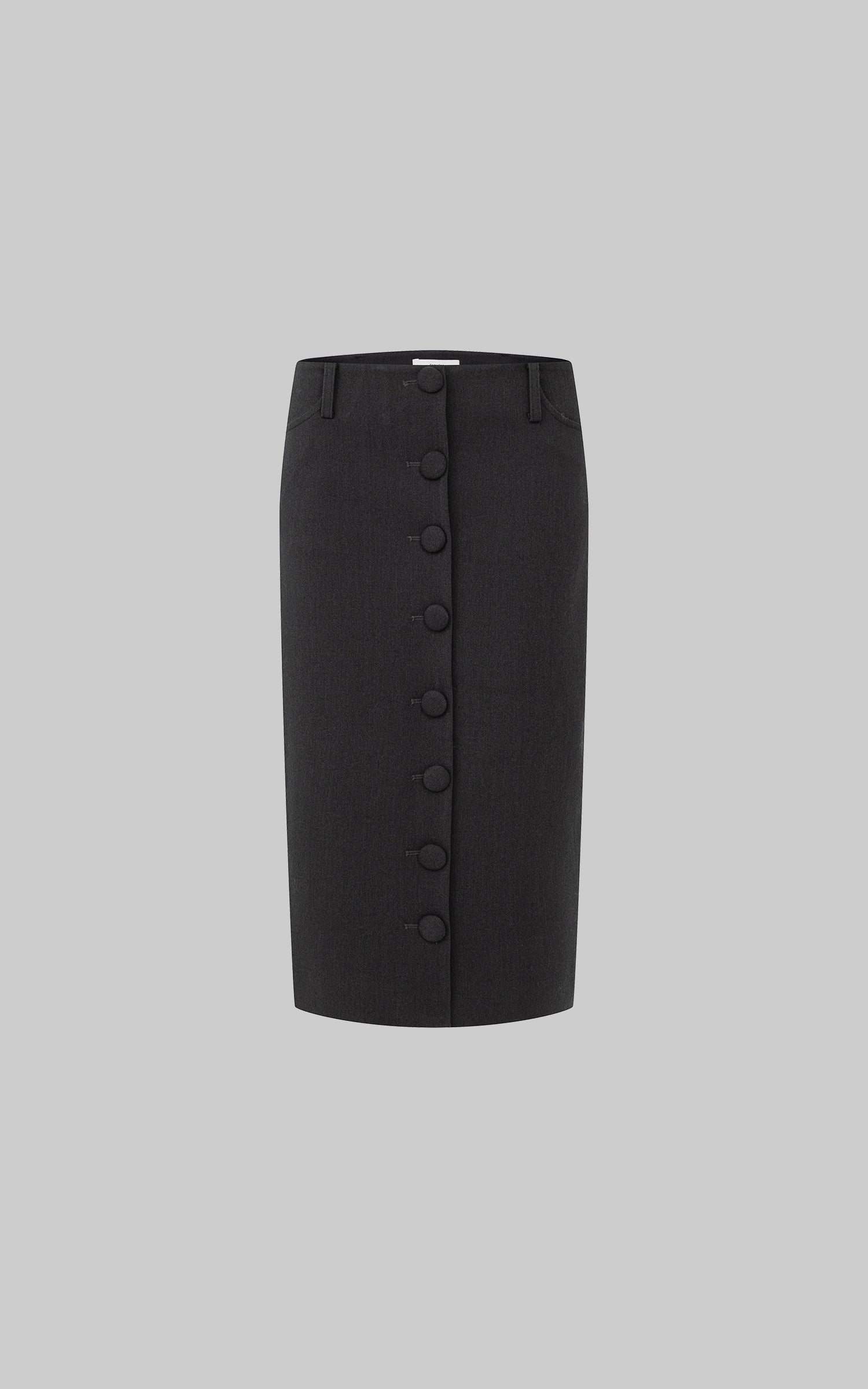 IAMXIAA ボタンフロントミディペンシルスカート、テーラードシルエット付き