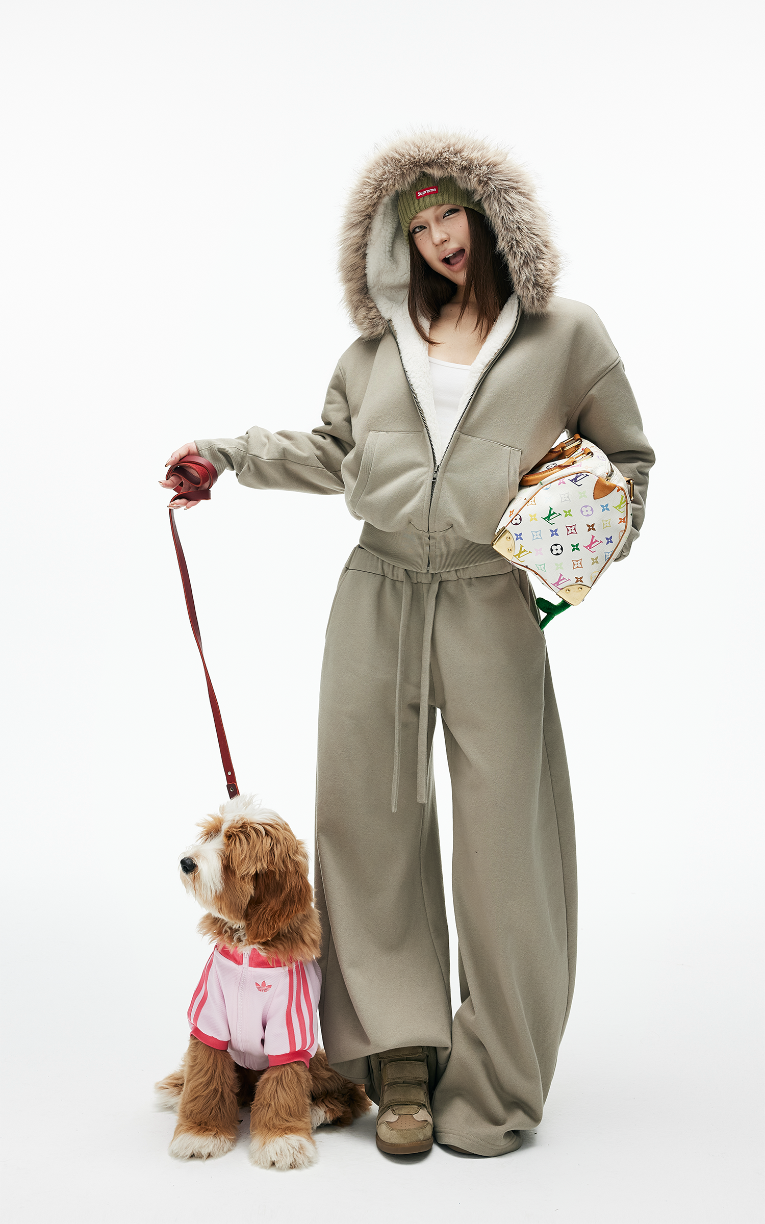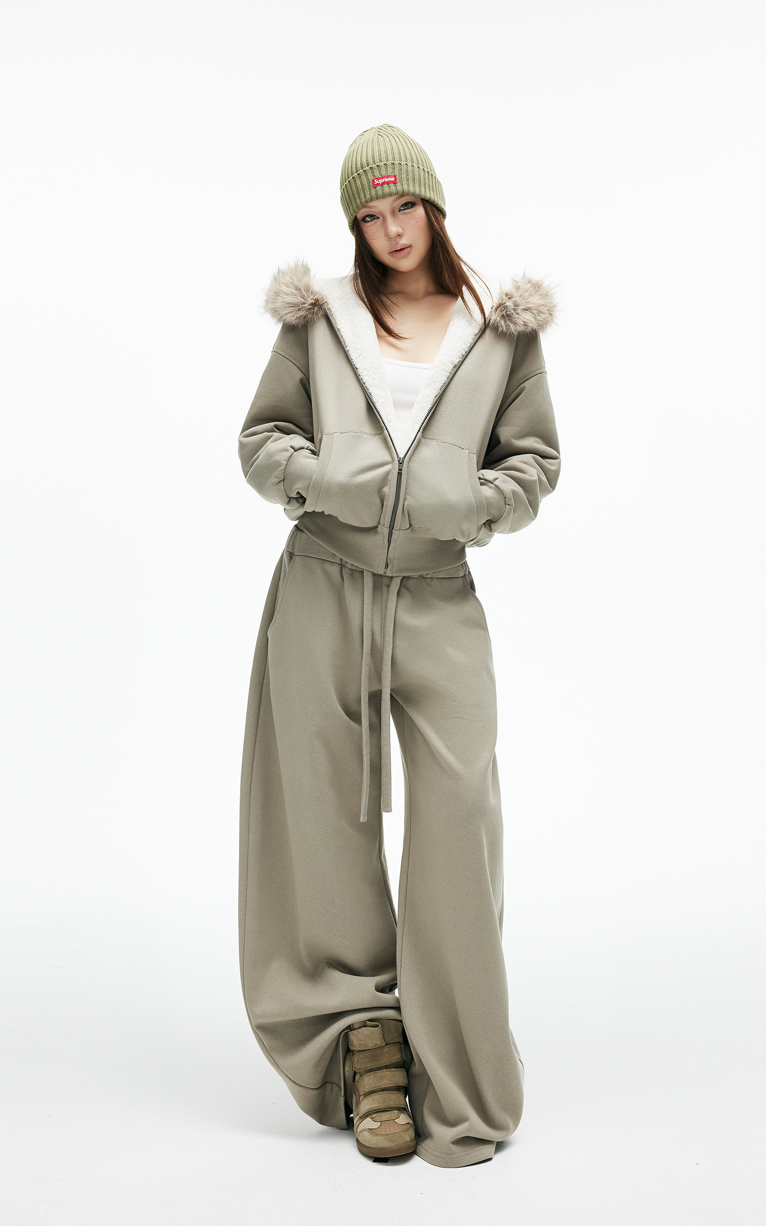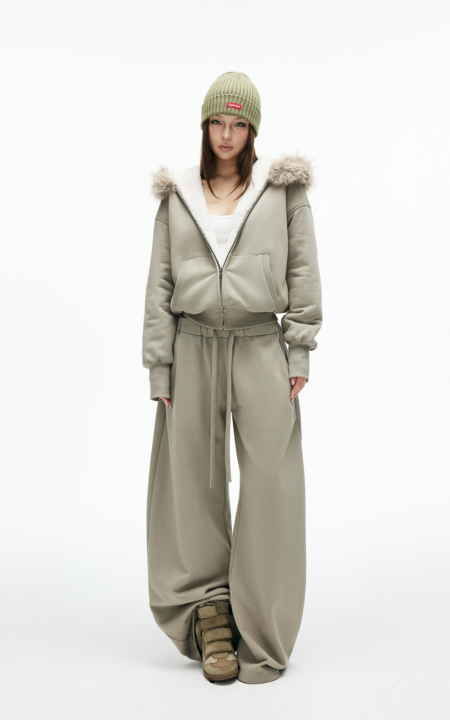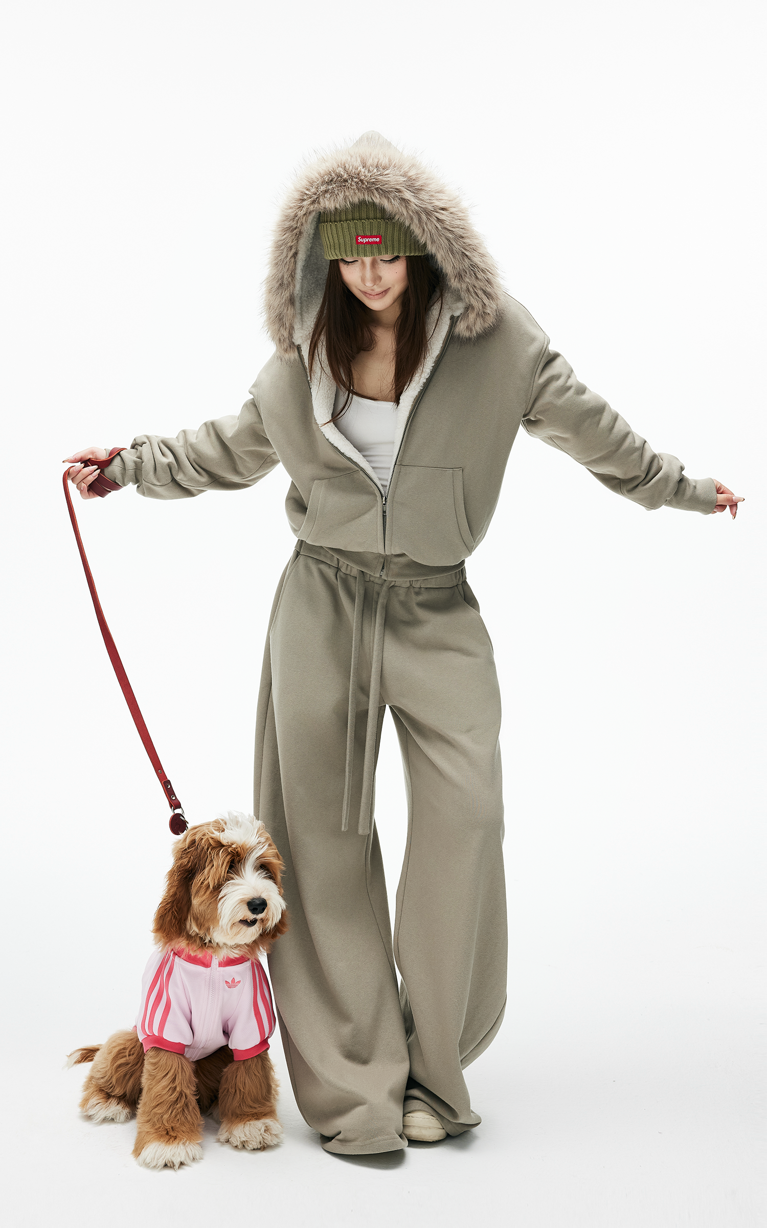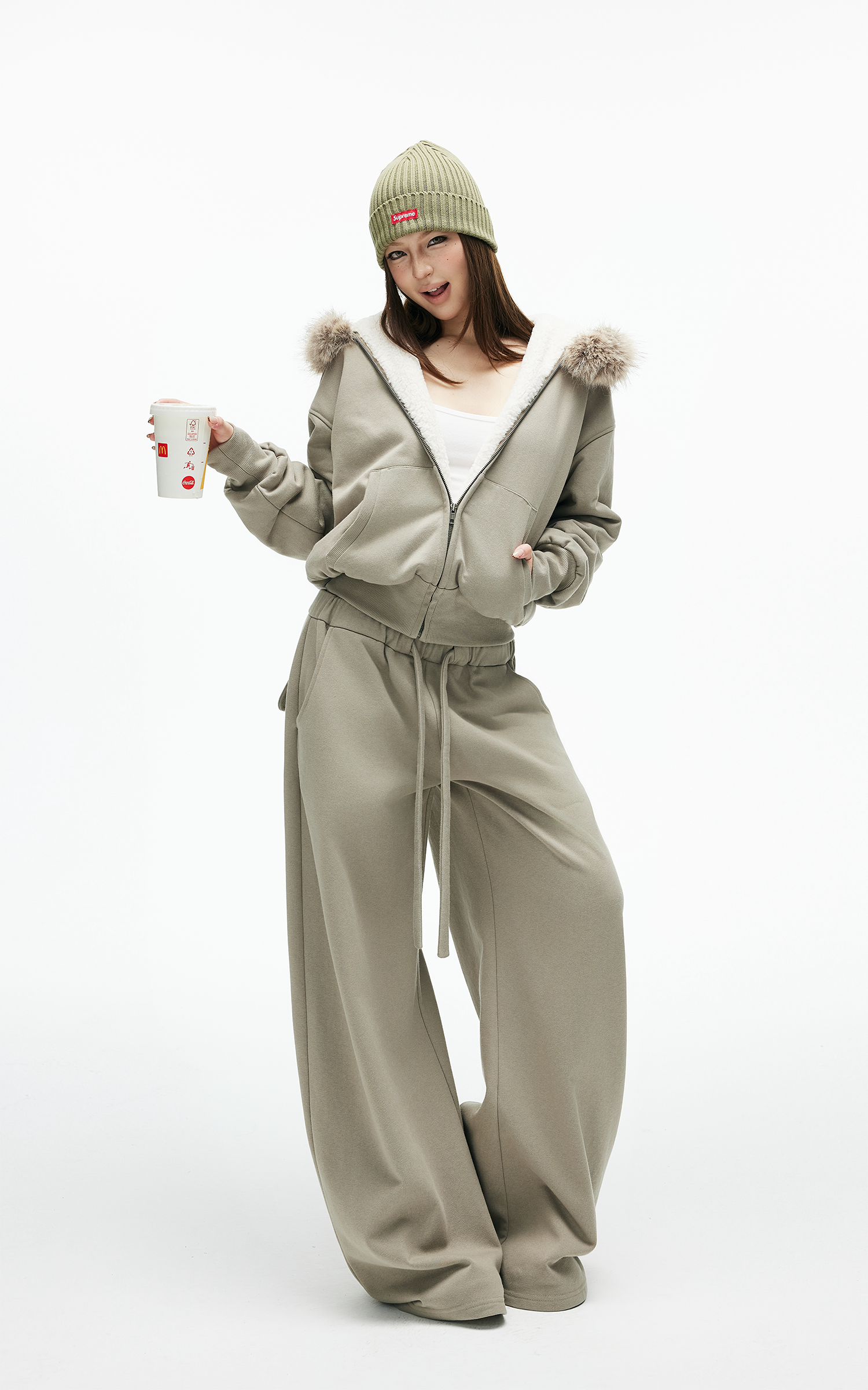 IAMXIAA フェイクファー トリム フーディ ジップ ジャケット & ワイドレッグ スウェットパンツ セット
