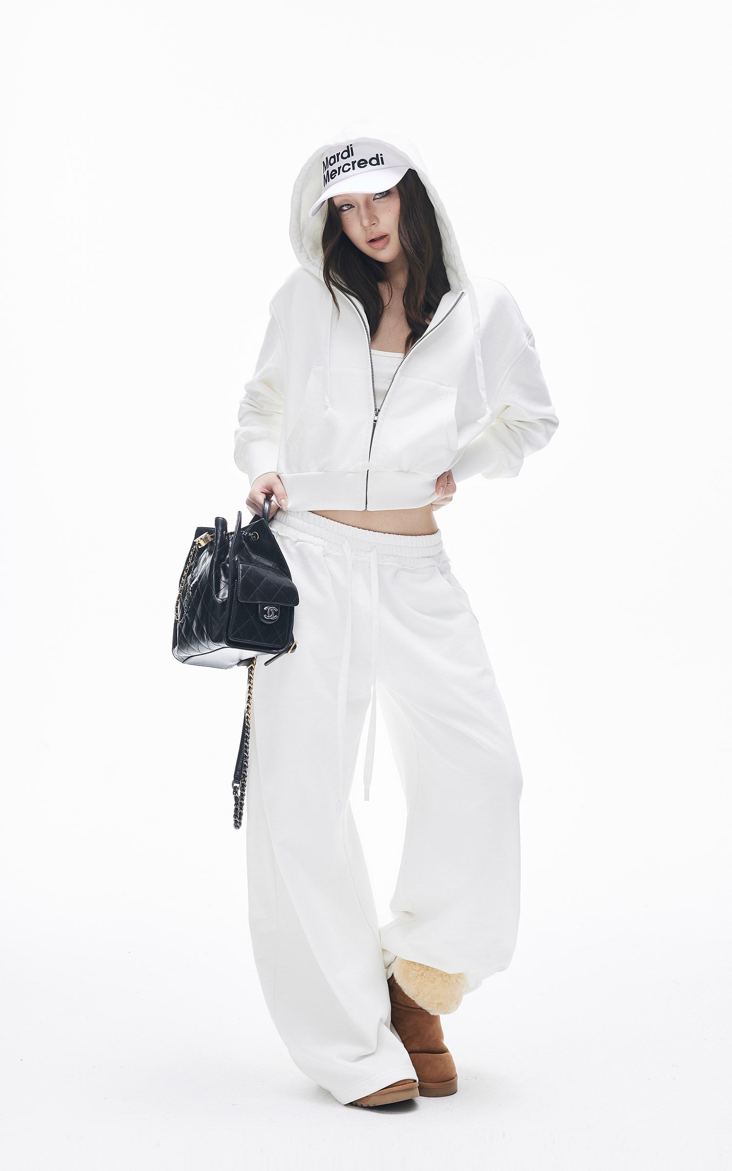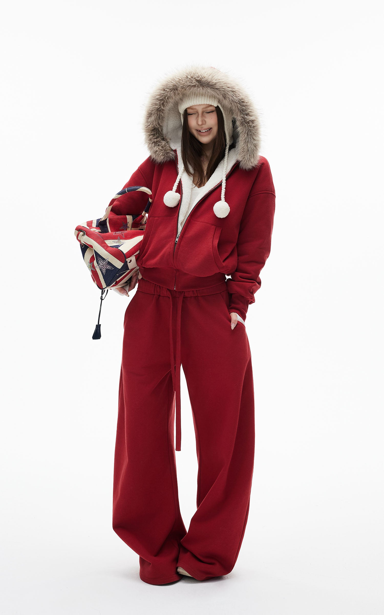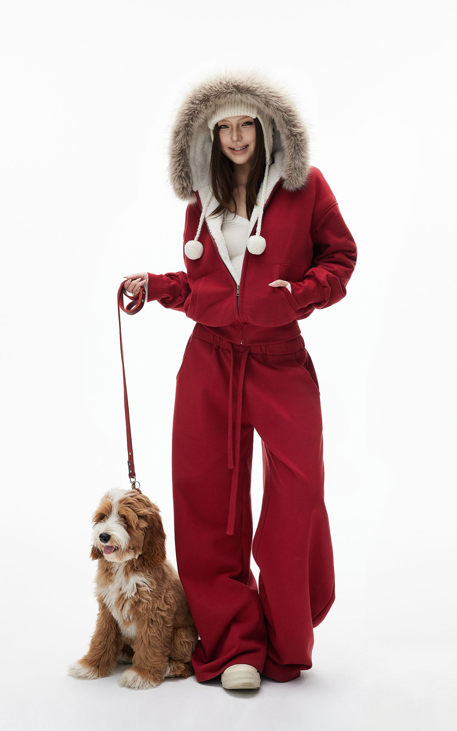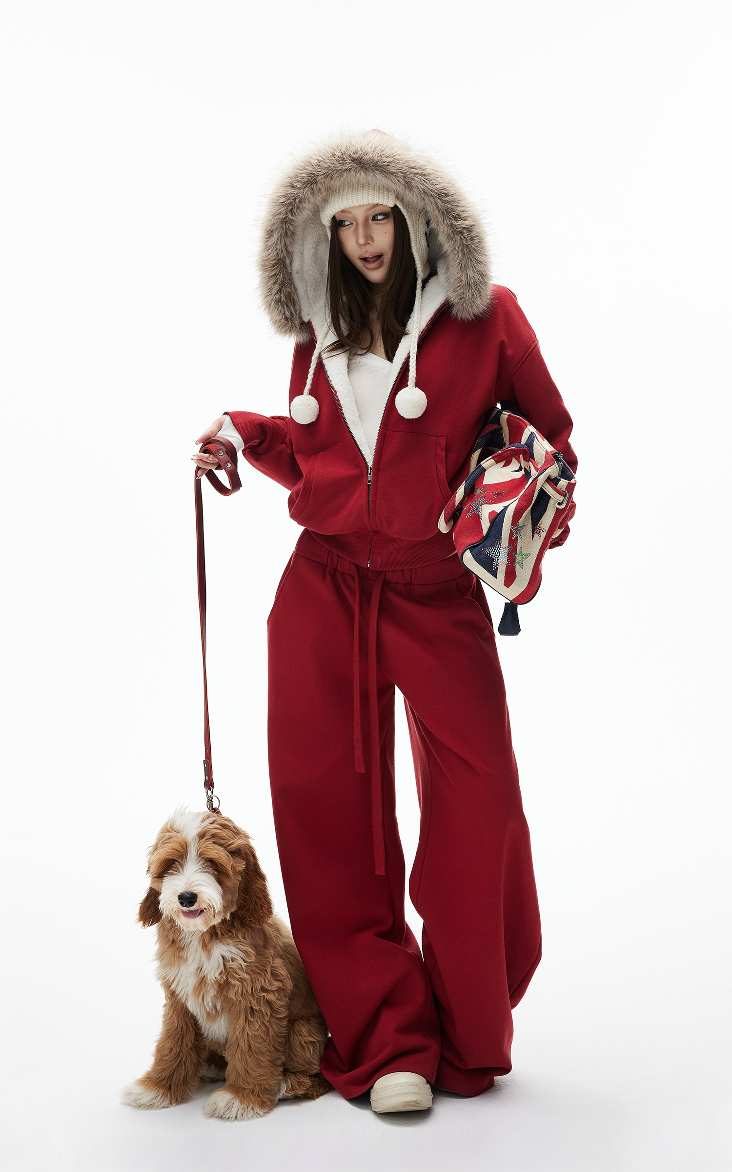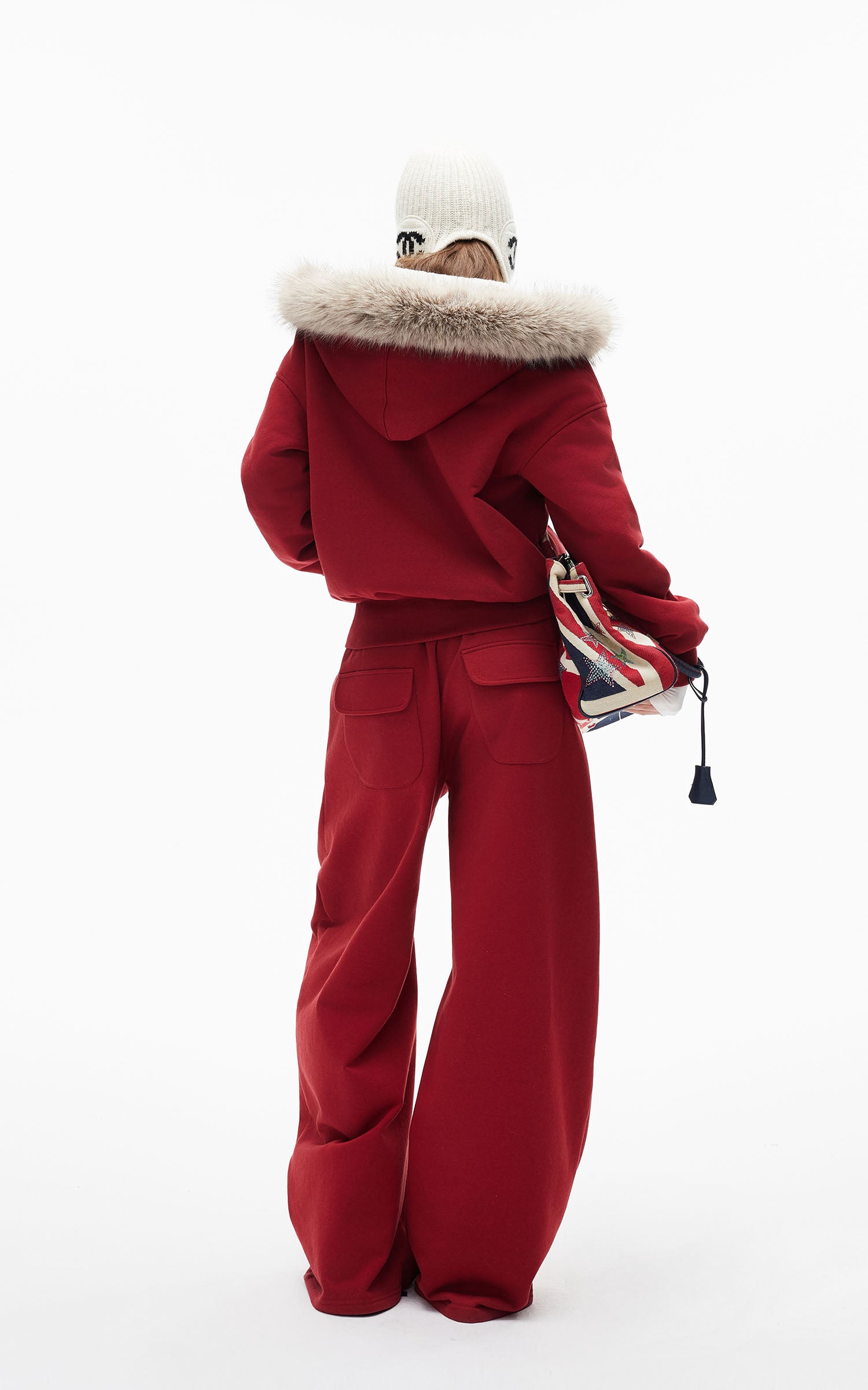 IAMXIAA フェイクファー トリム フーディ ジップ ジャケット & ワイドレッグ スウェットパンツ セット