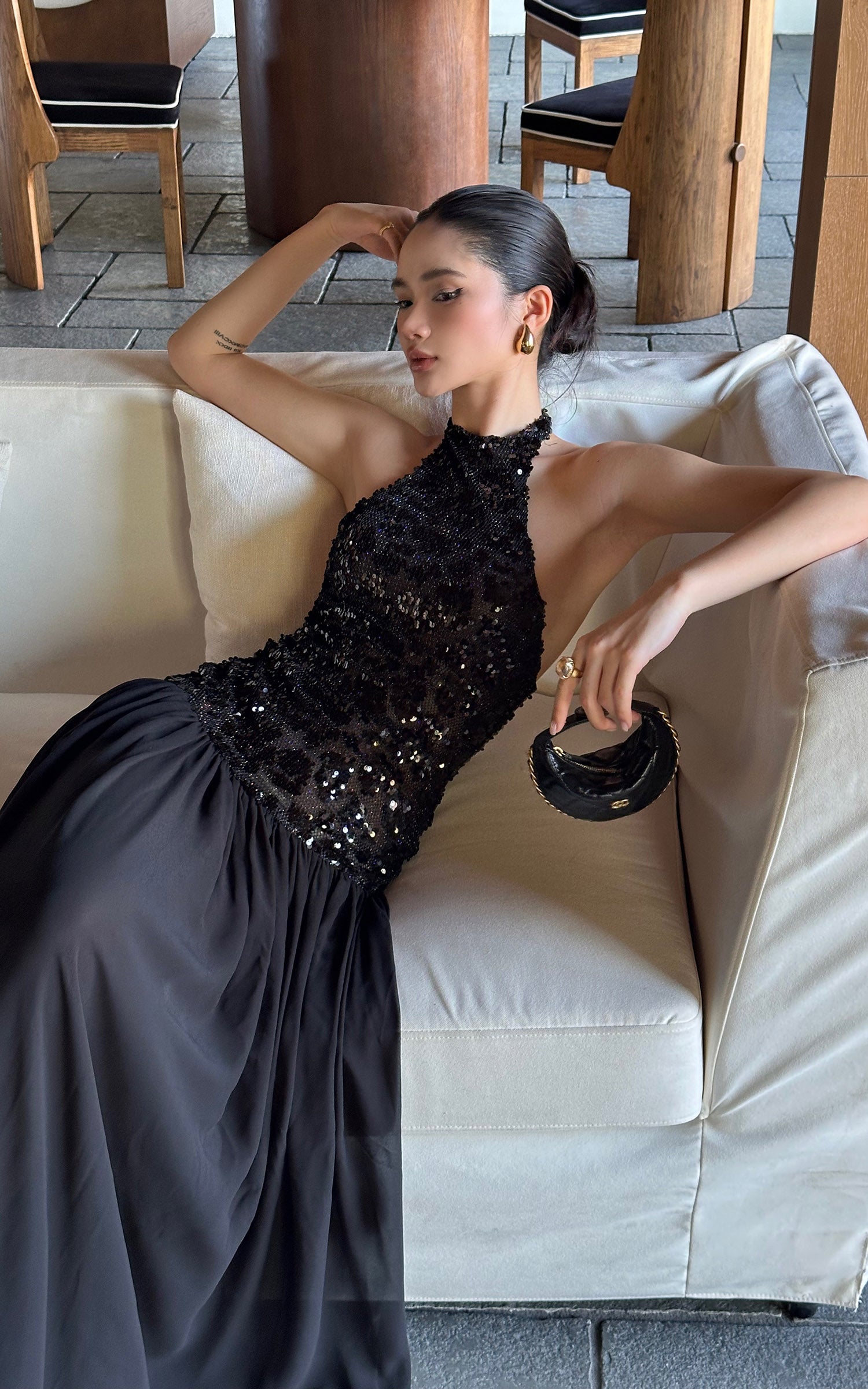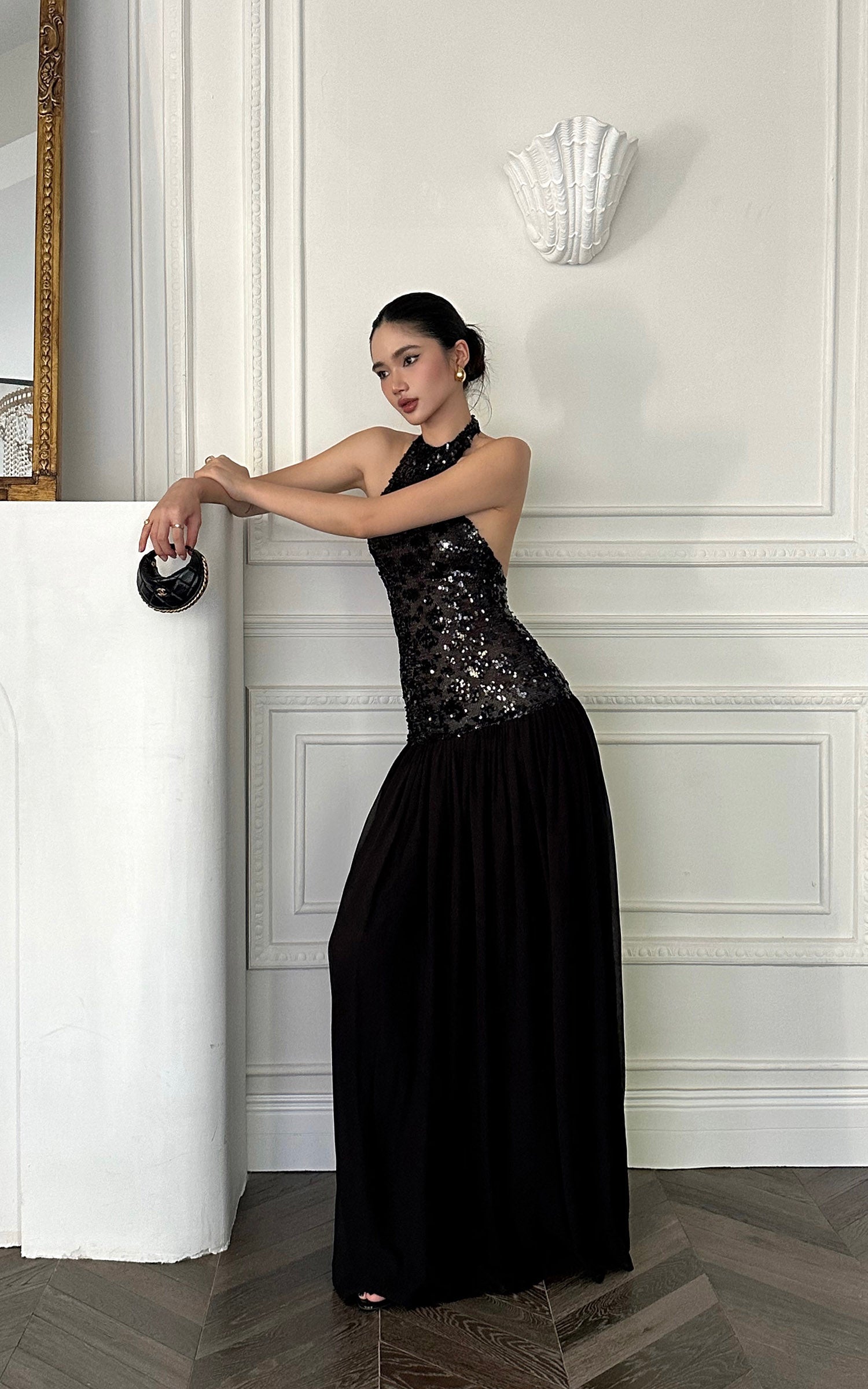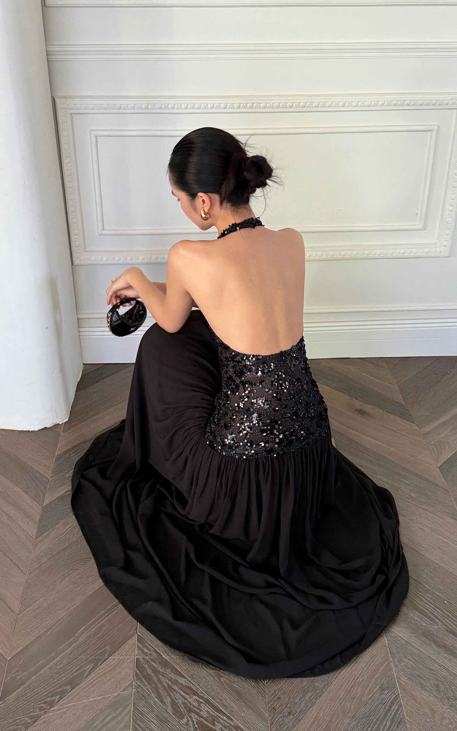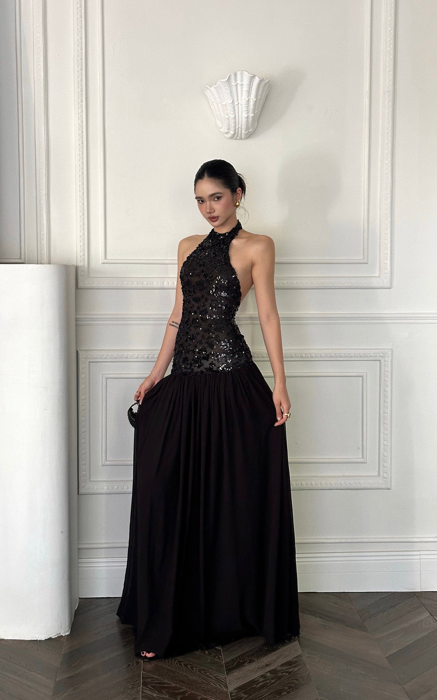 ROVENTE スパンコール付きホルターマキシドレス