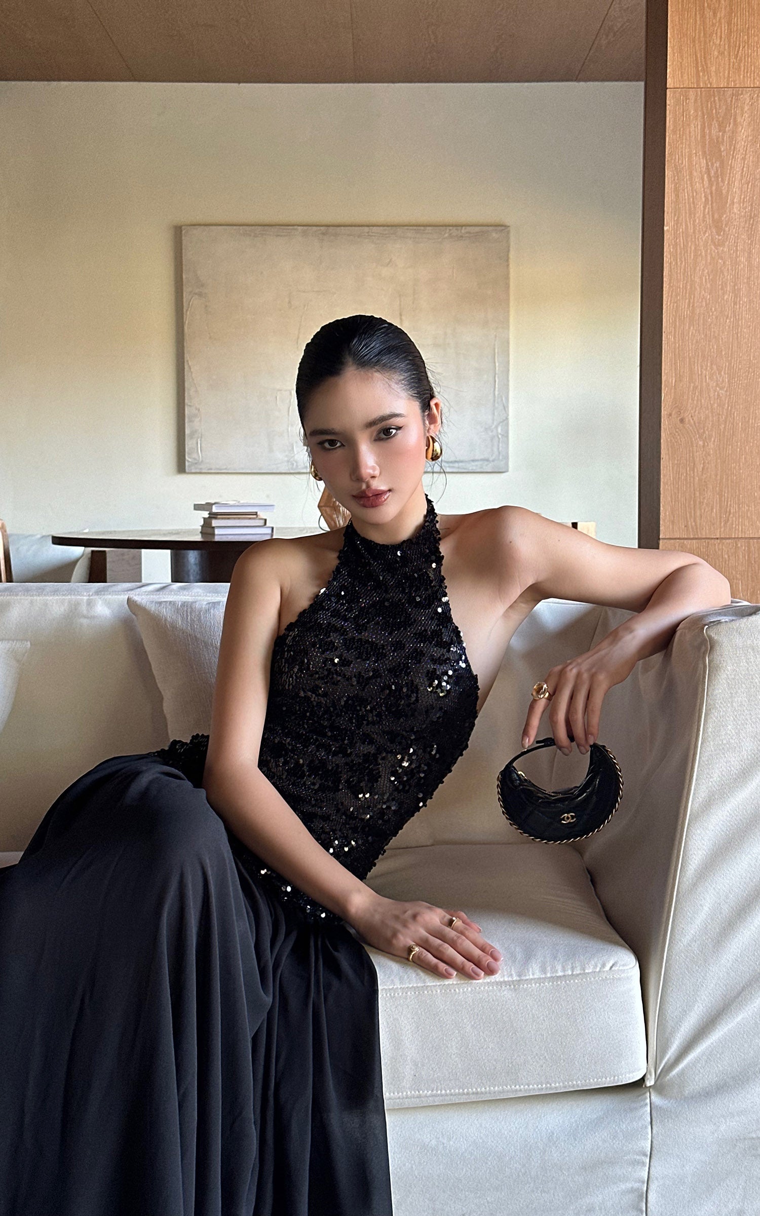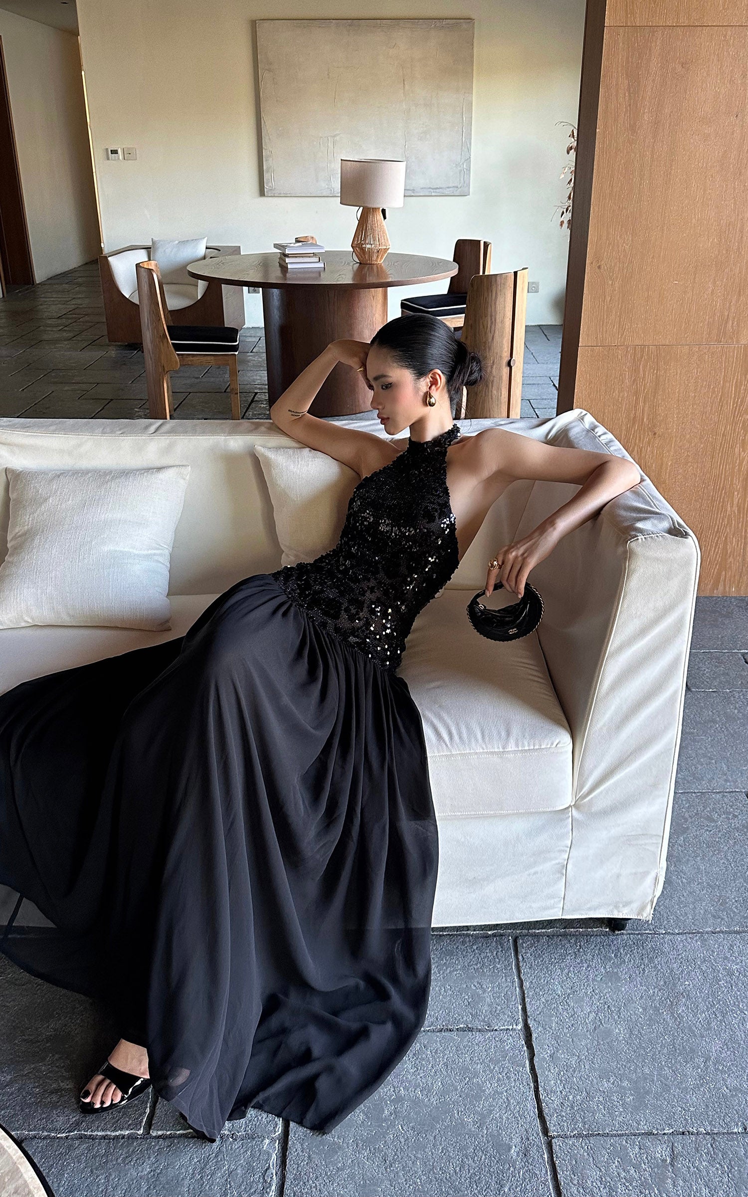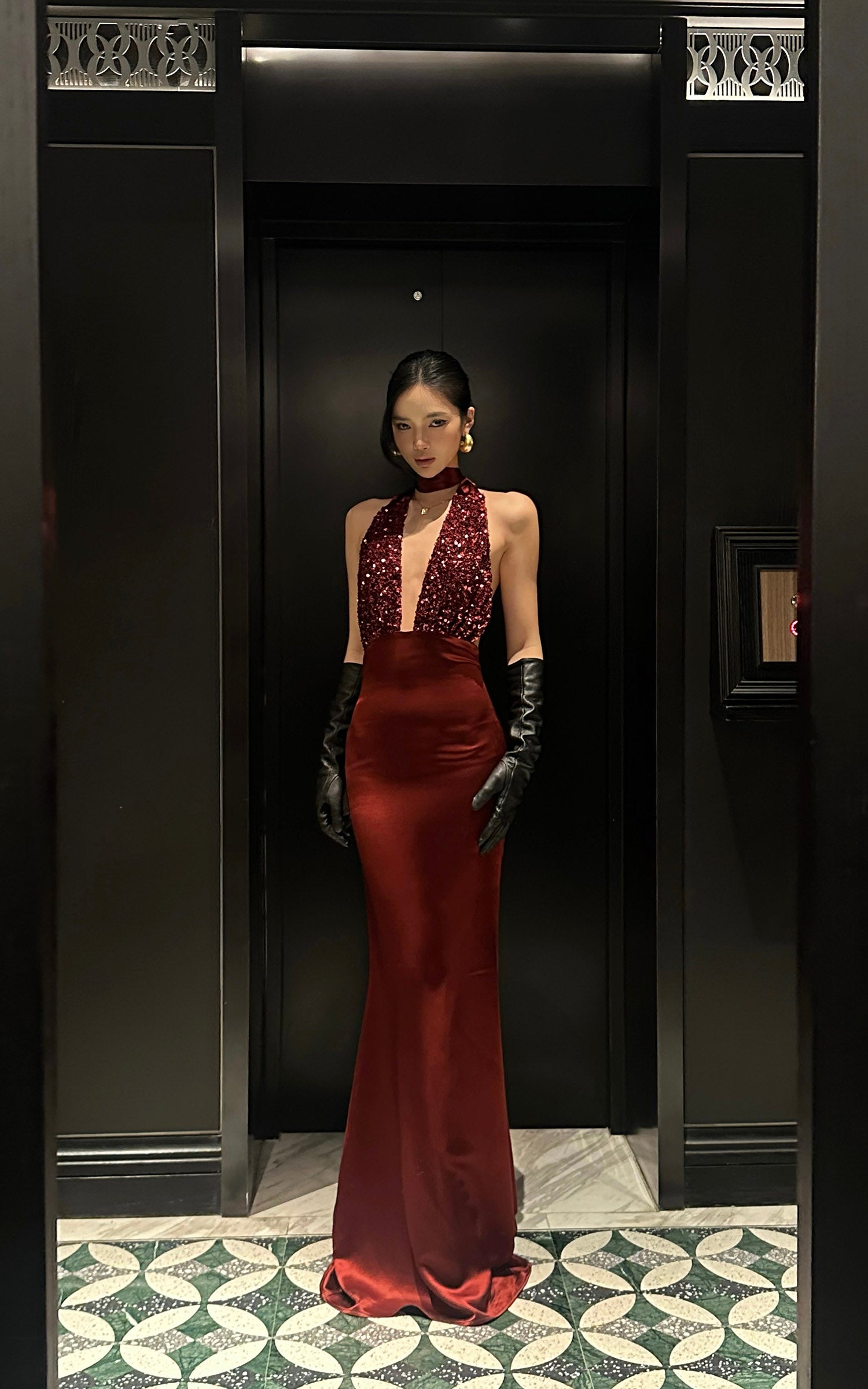 ROVENTE スパンコール付きホルターマキシドレス