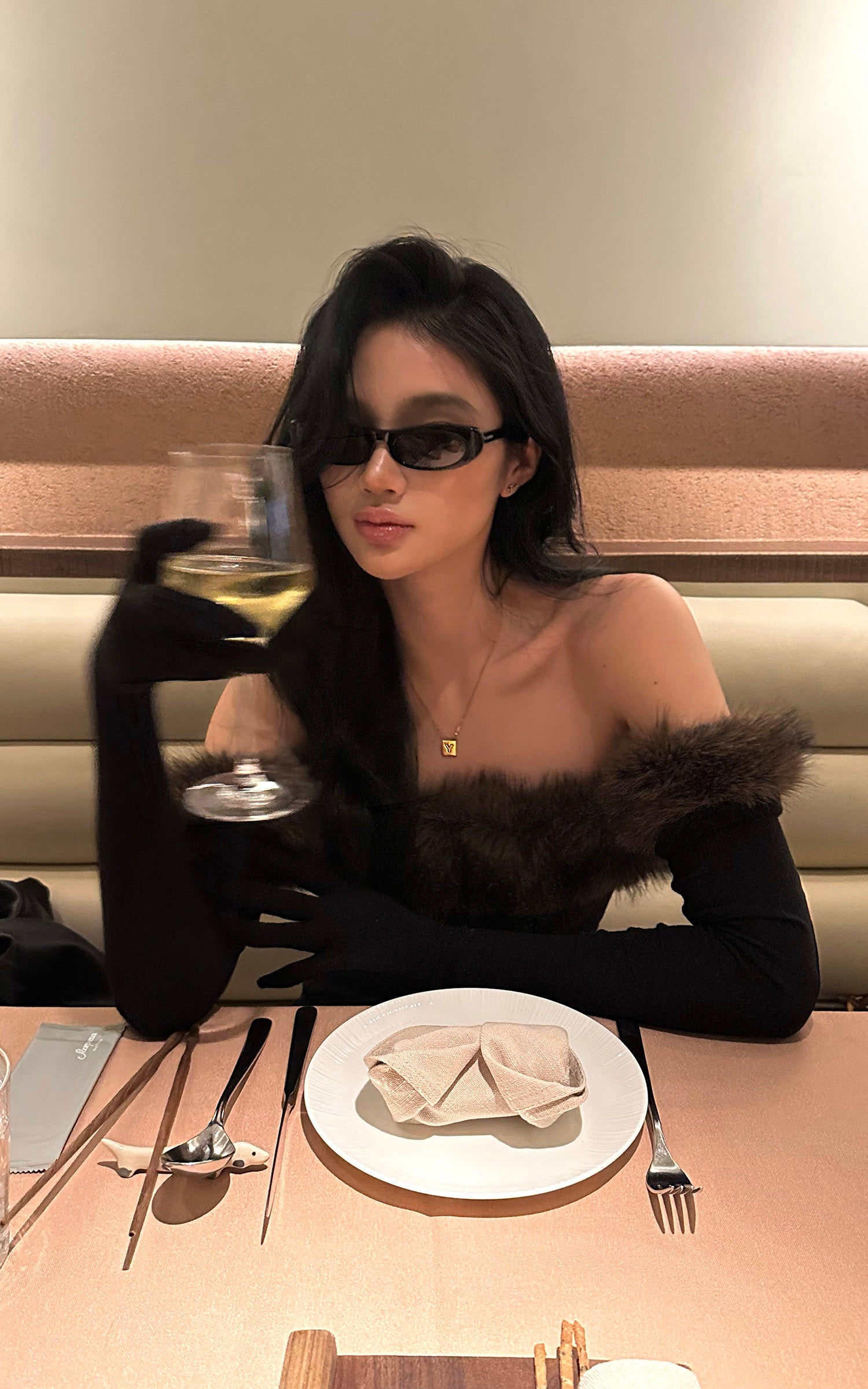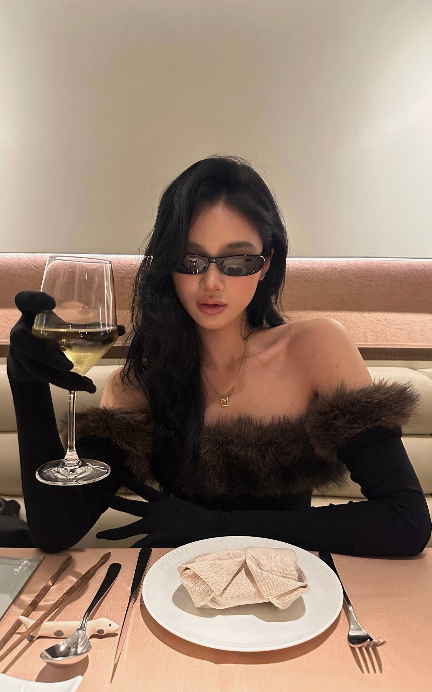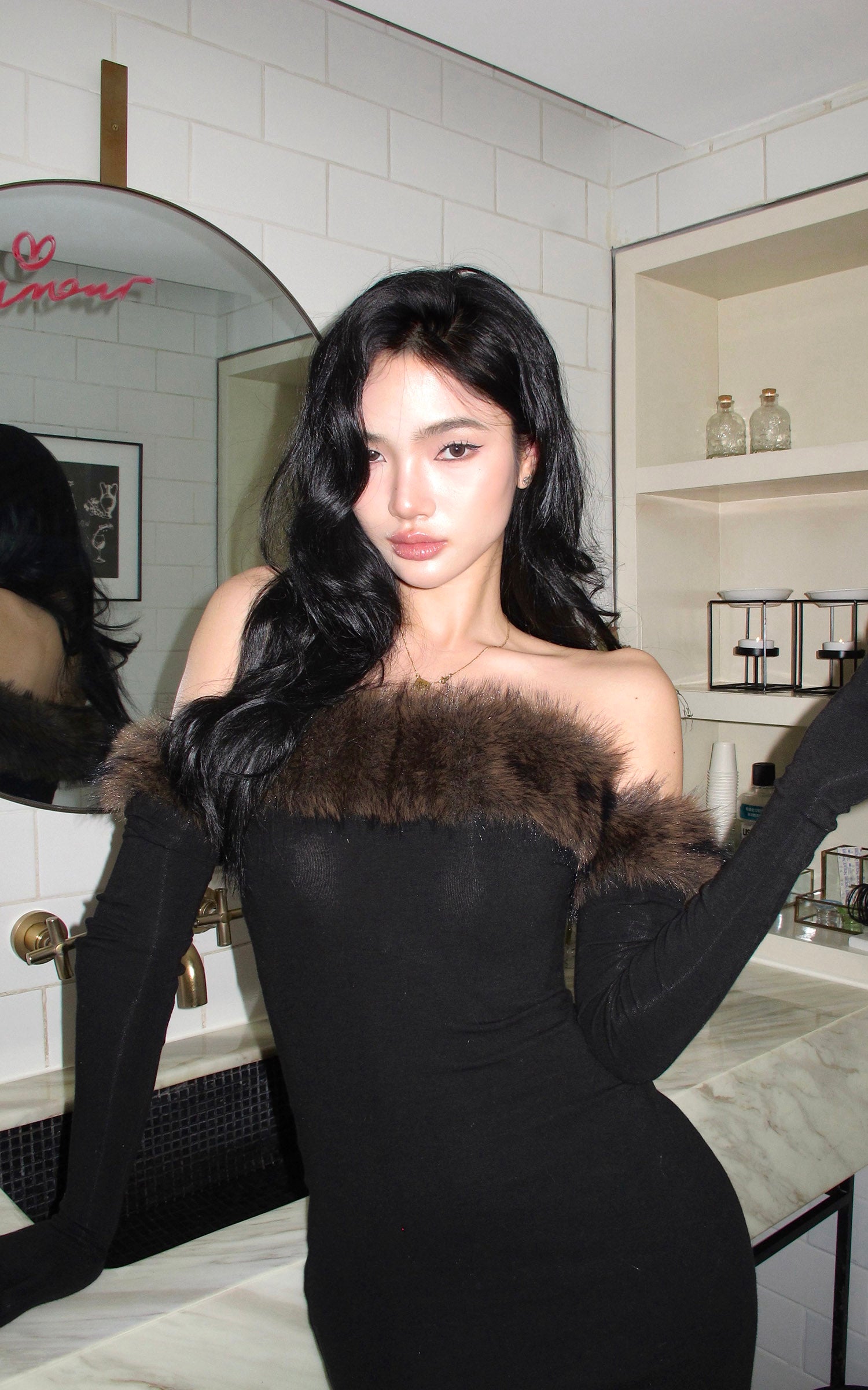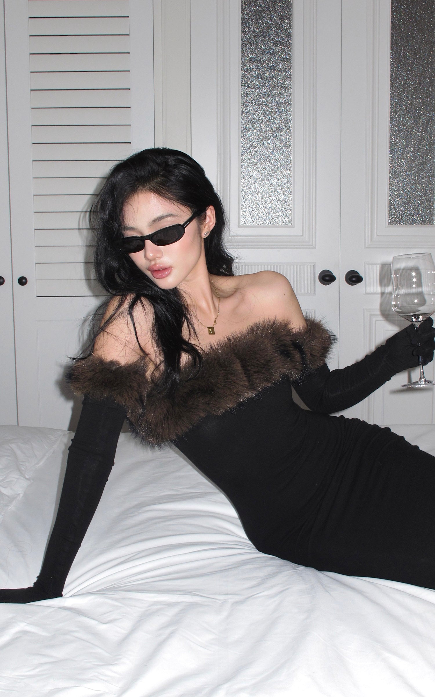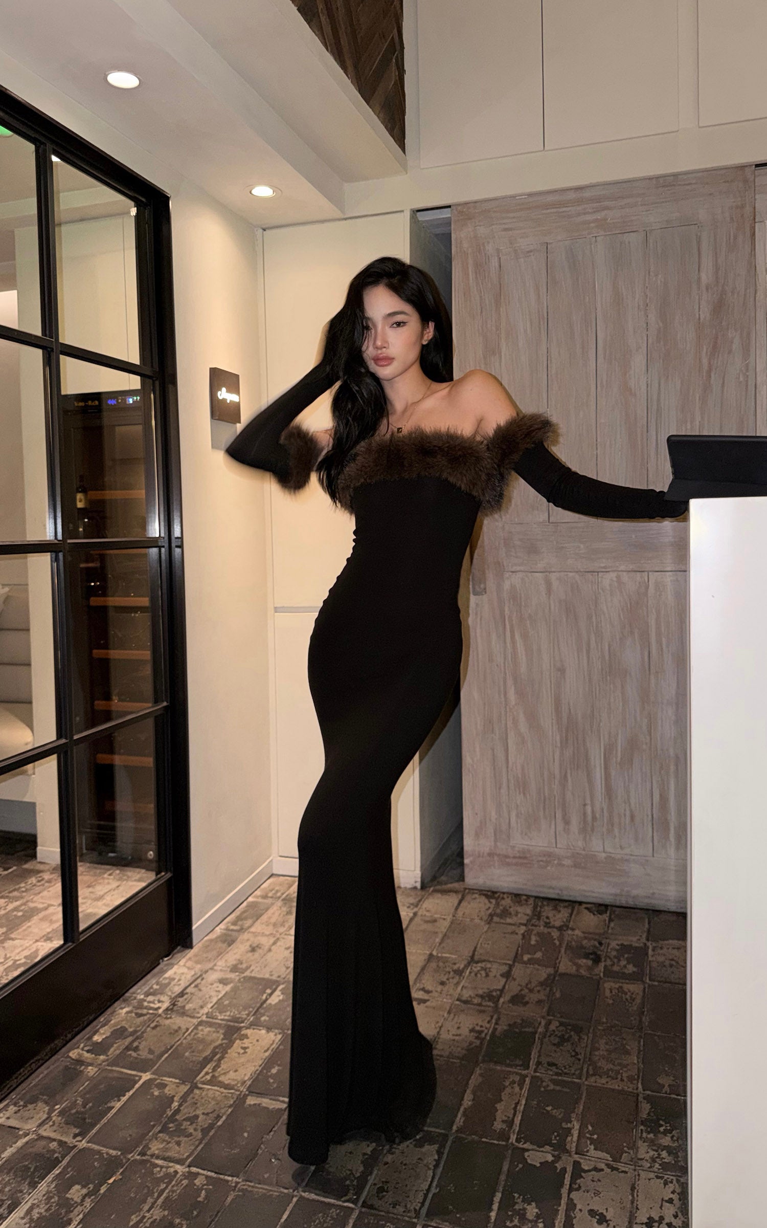 ROVENTE フェイクファーオフショルダー ロングドレス