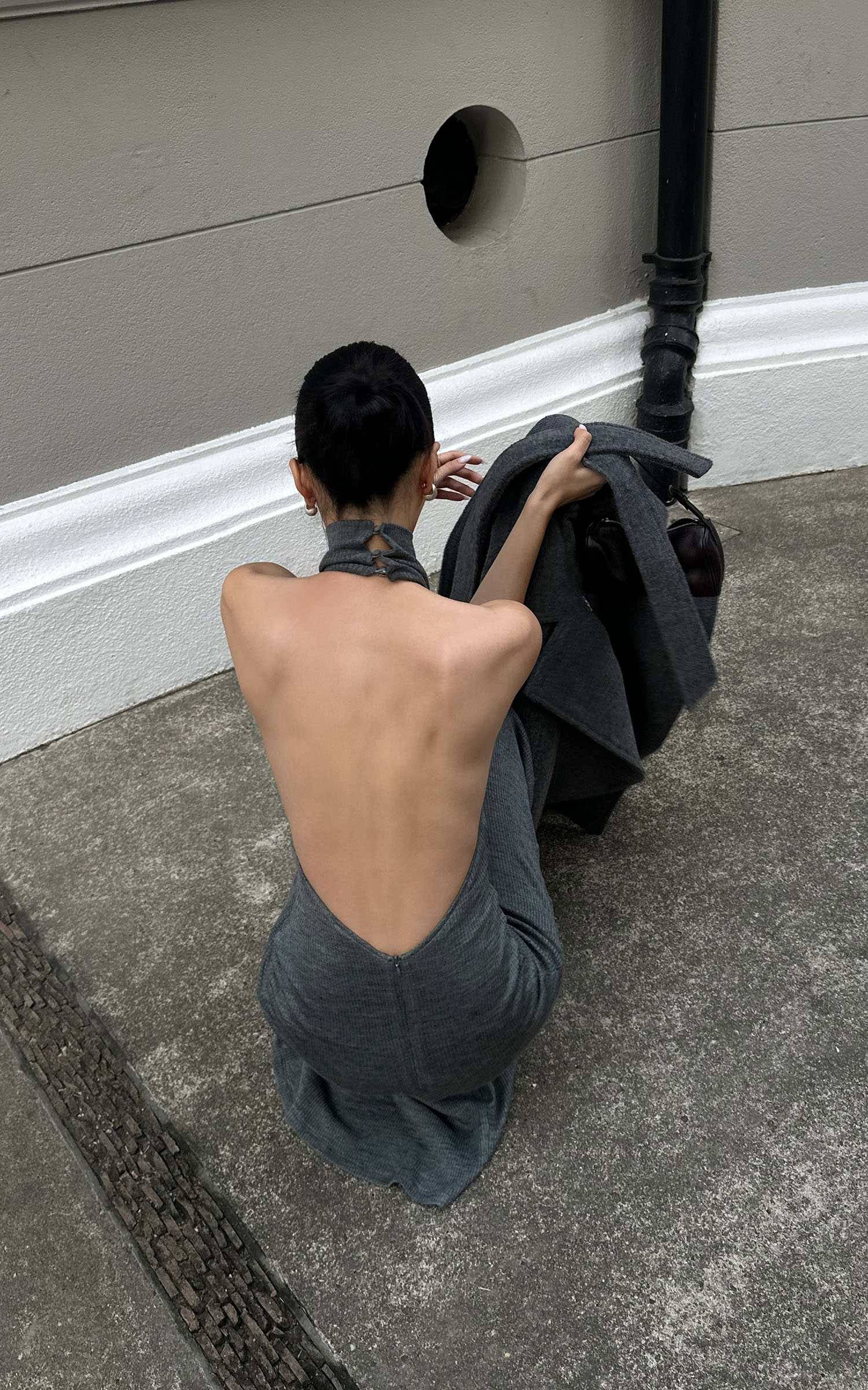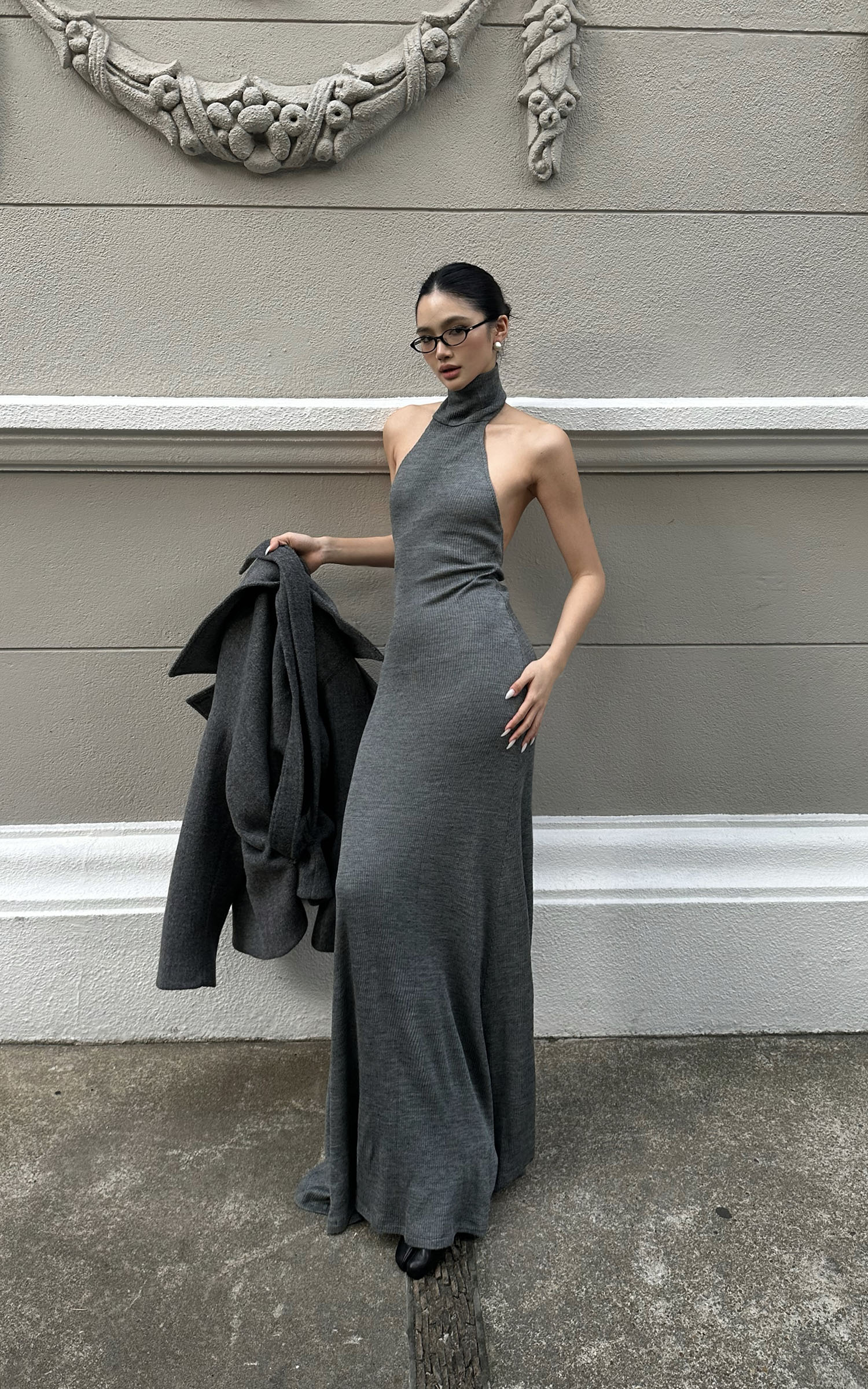ROVENTE ハルターバックレスリブニットマキシドレス