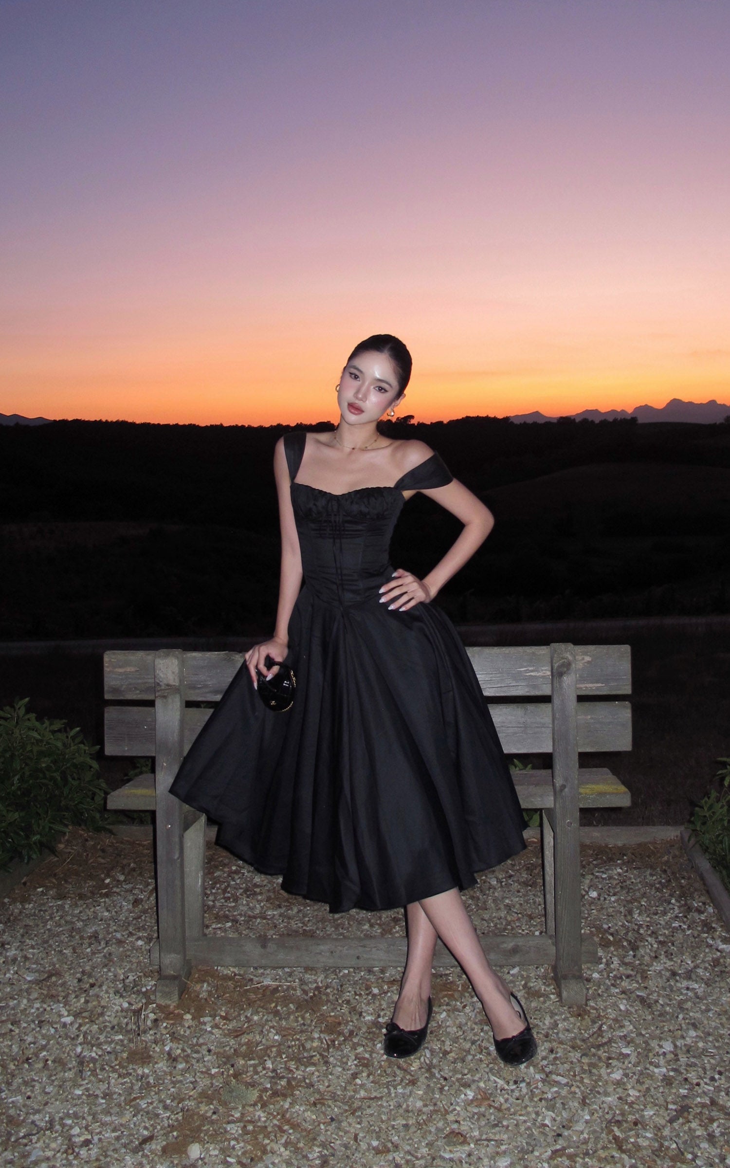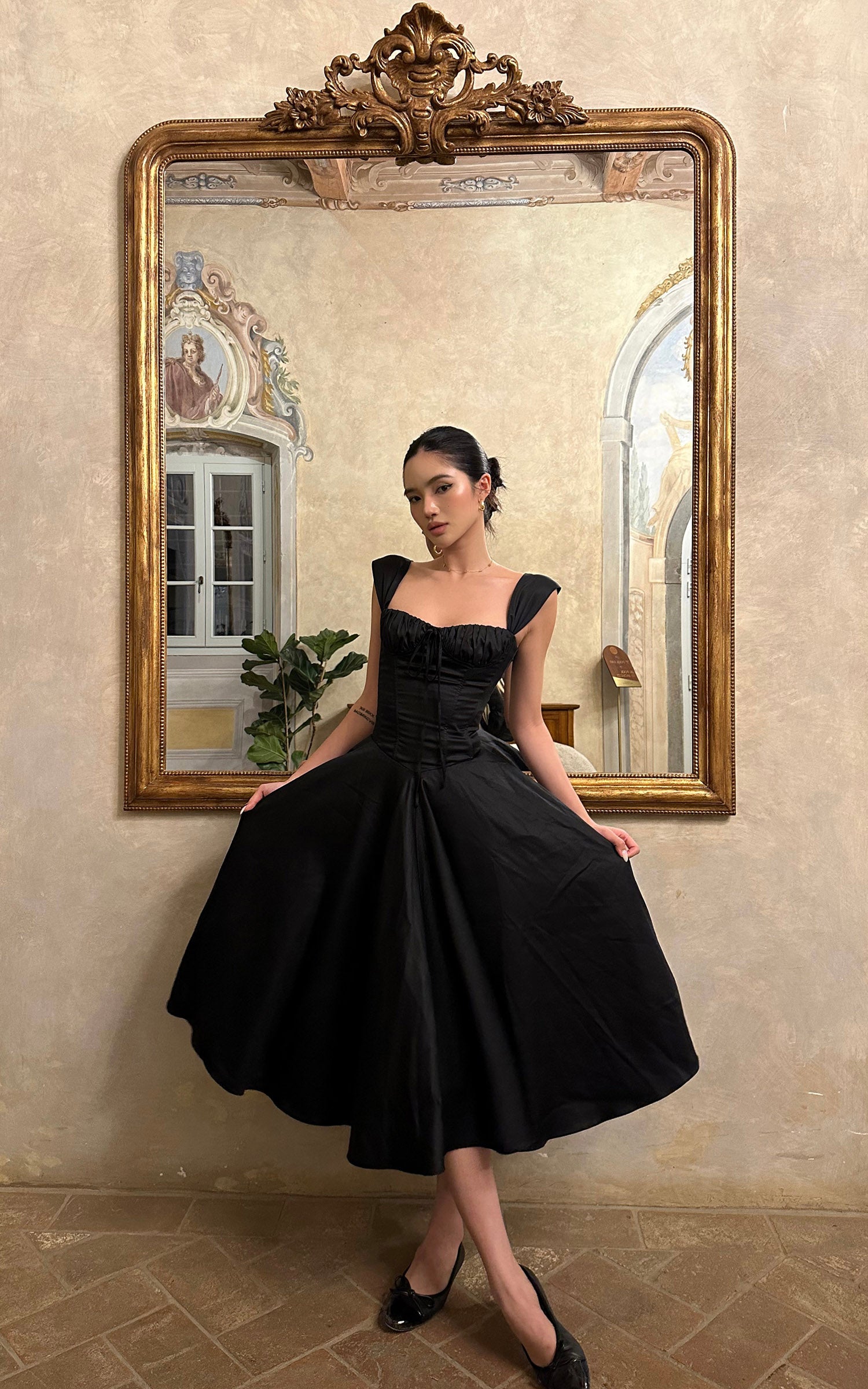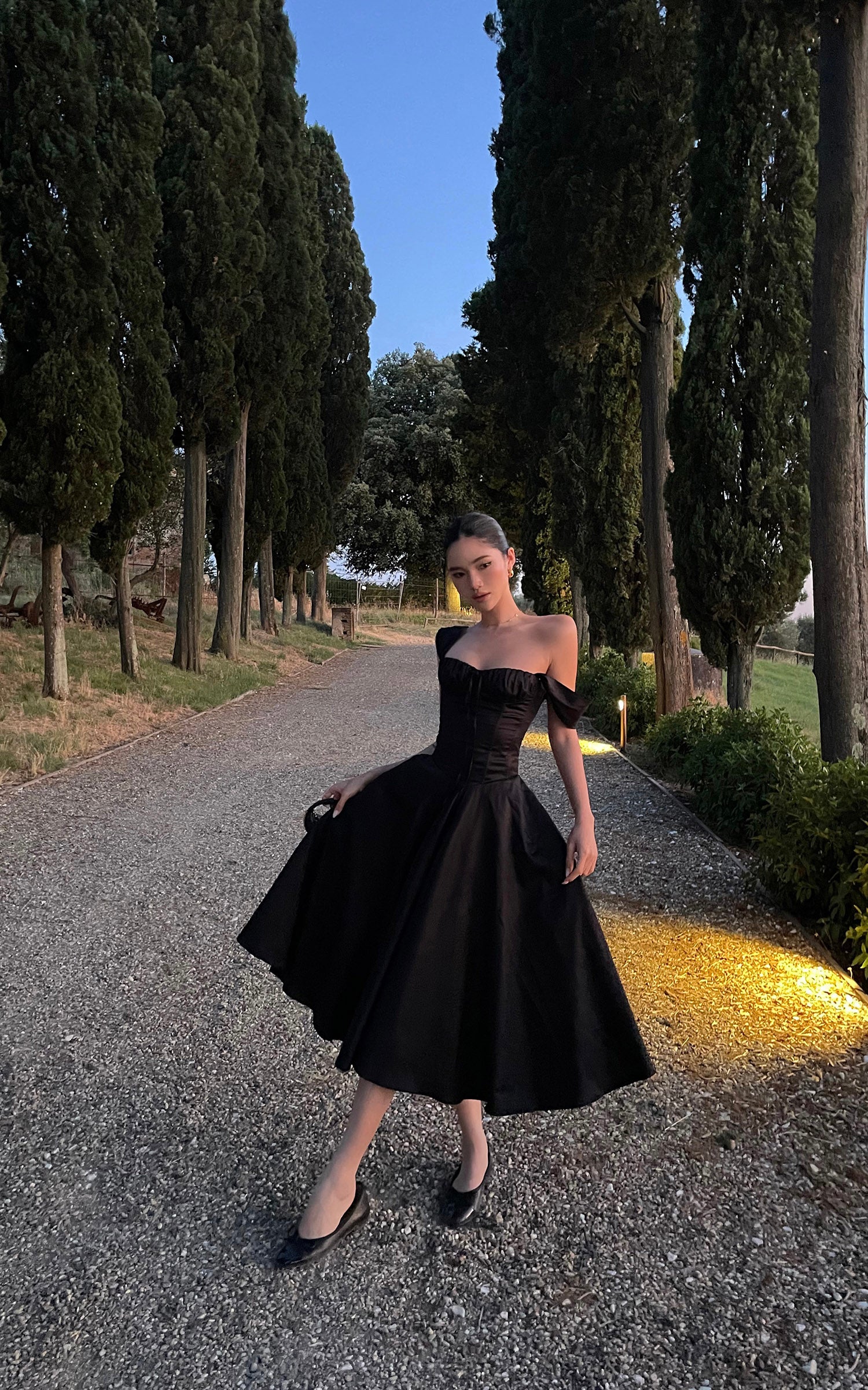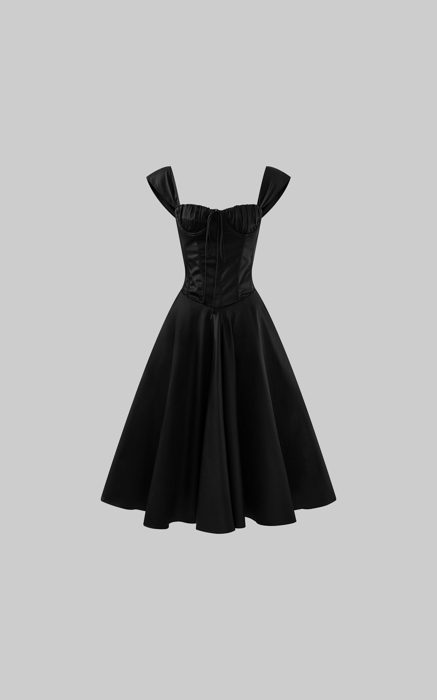 ROVENTE オフショルダー サテン コルセット ミディドレス フレアスカート付き