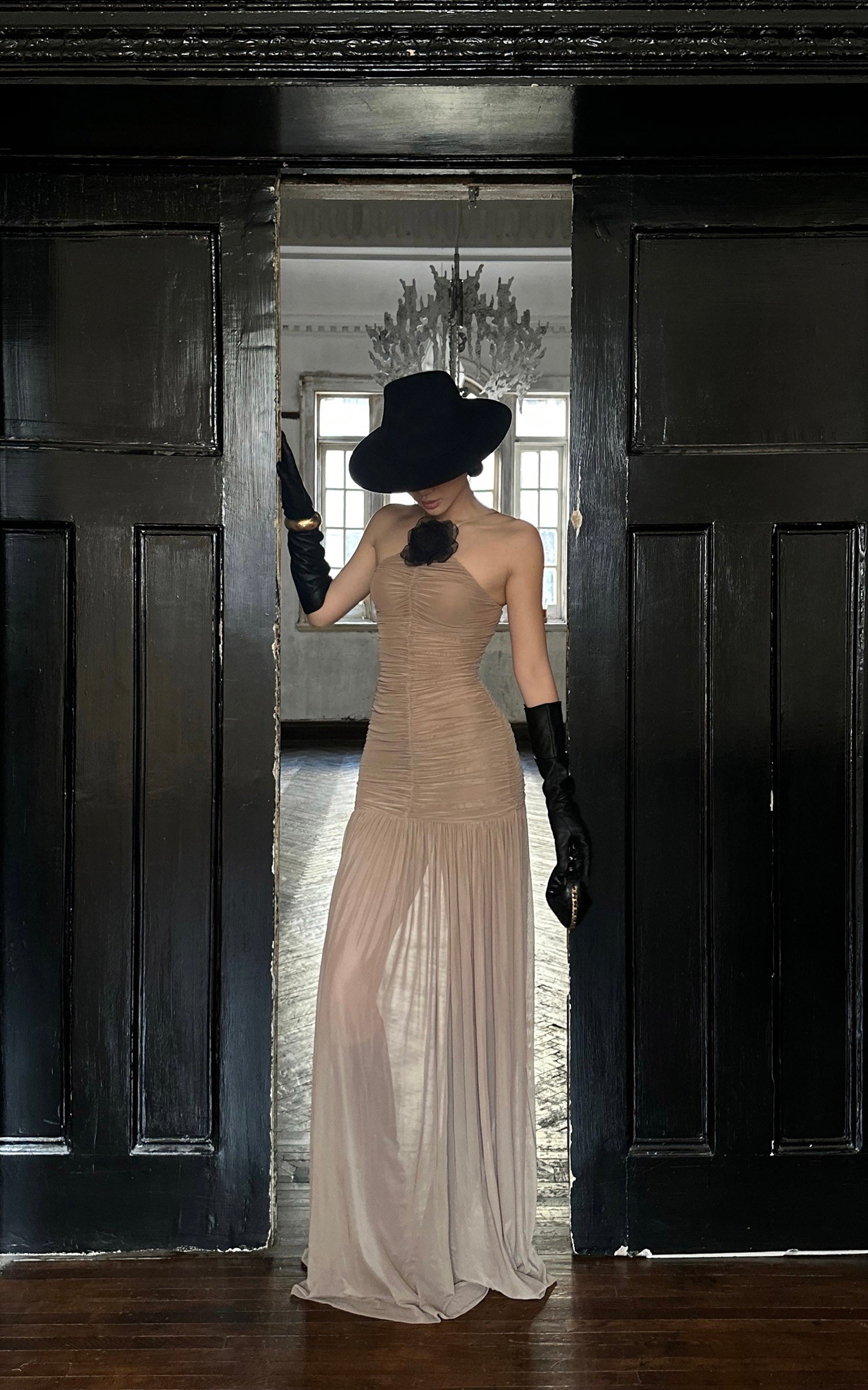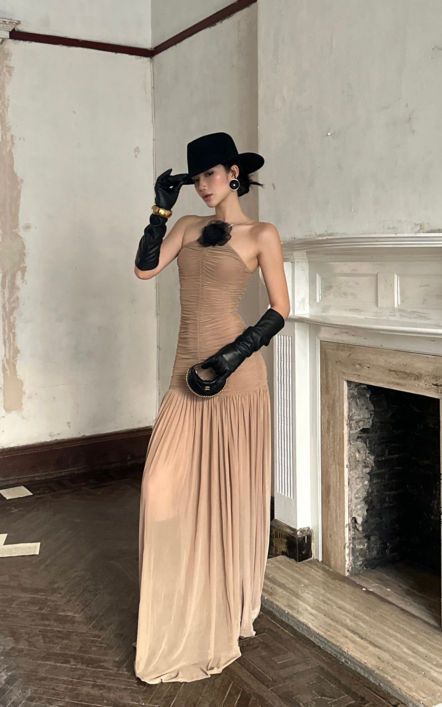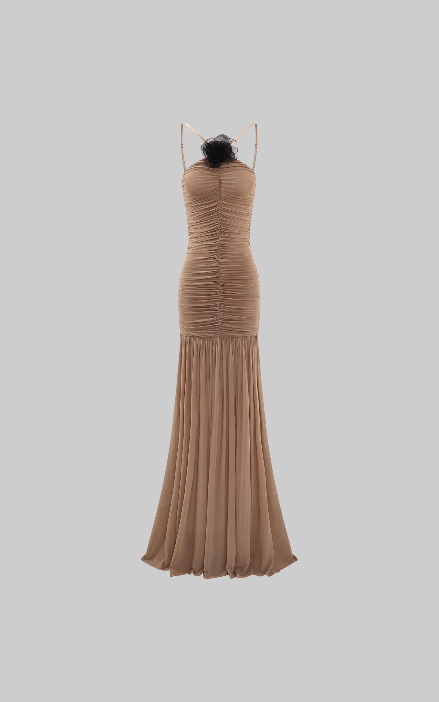 ROVENTE 取り外し可能なフラワーブローチ付きギャザーメッシュマキシドレス&フローヘム