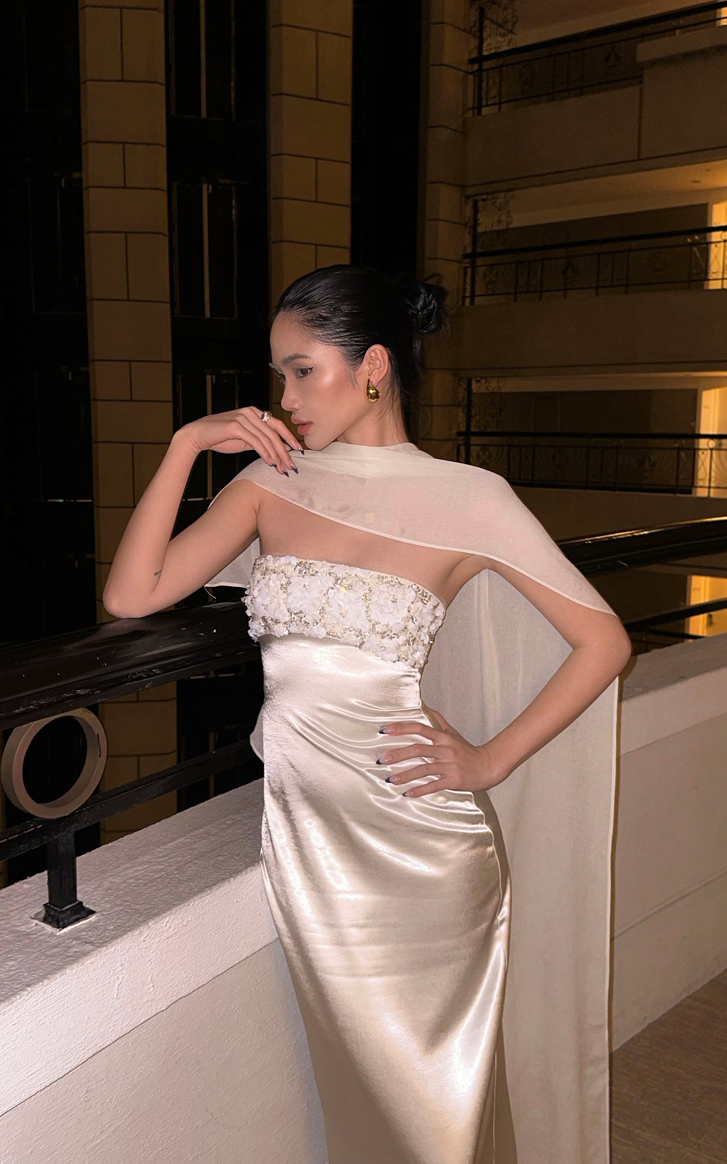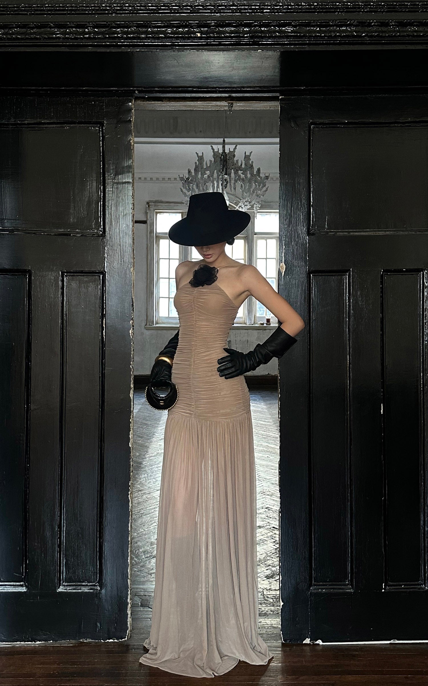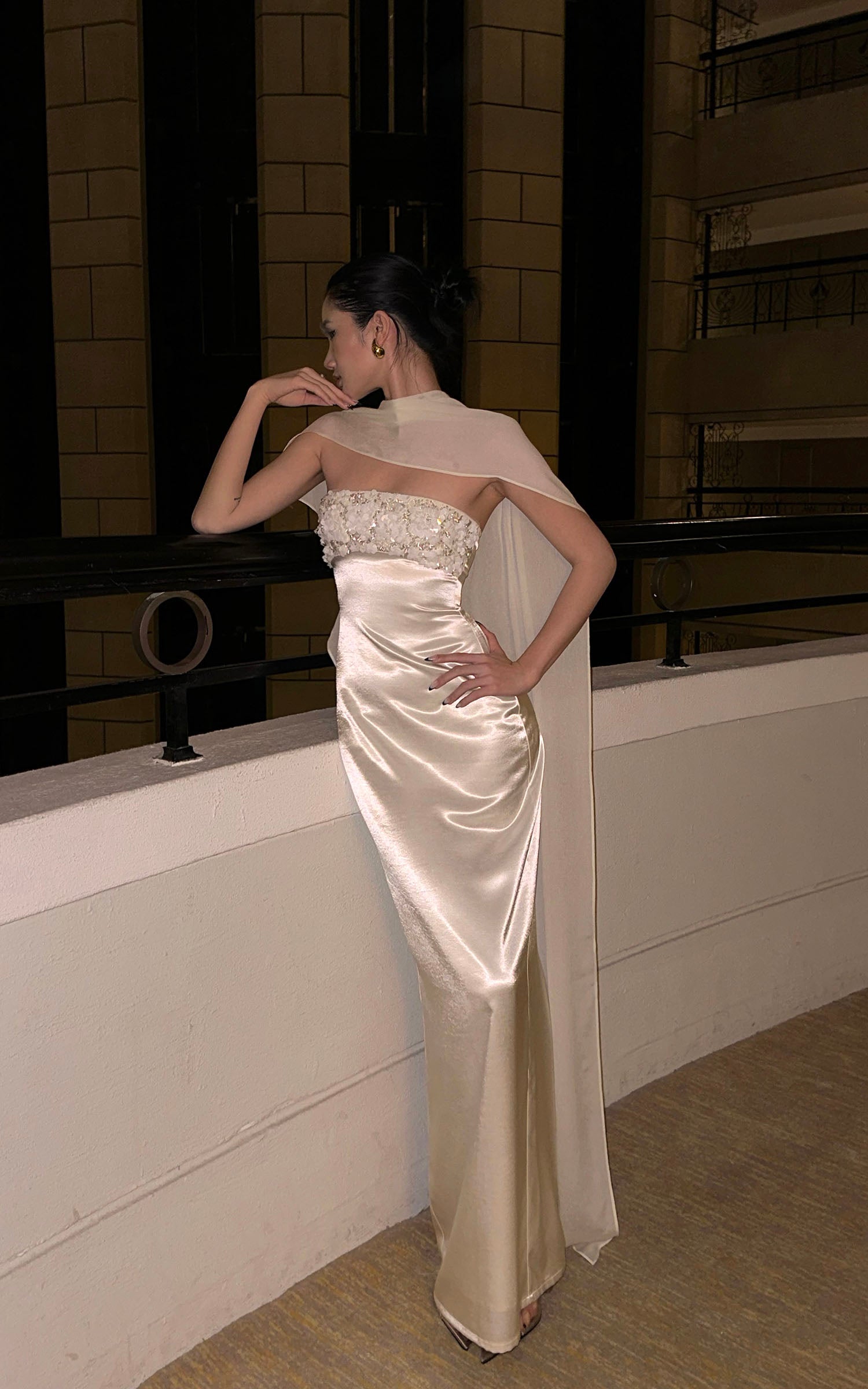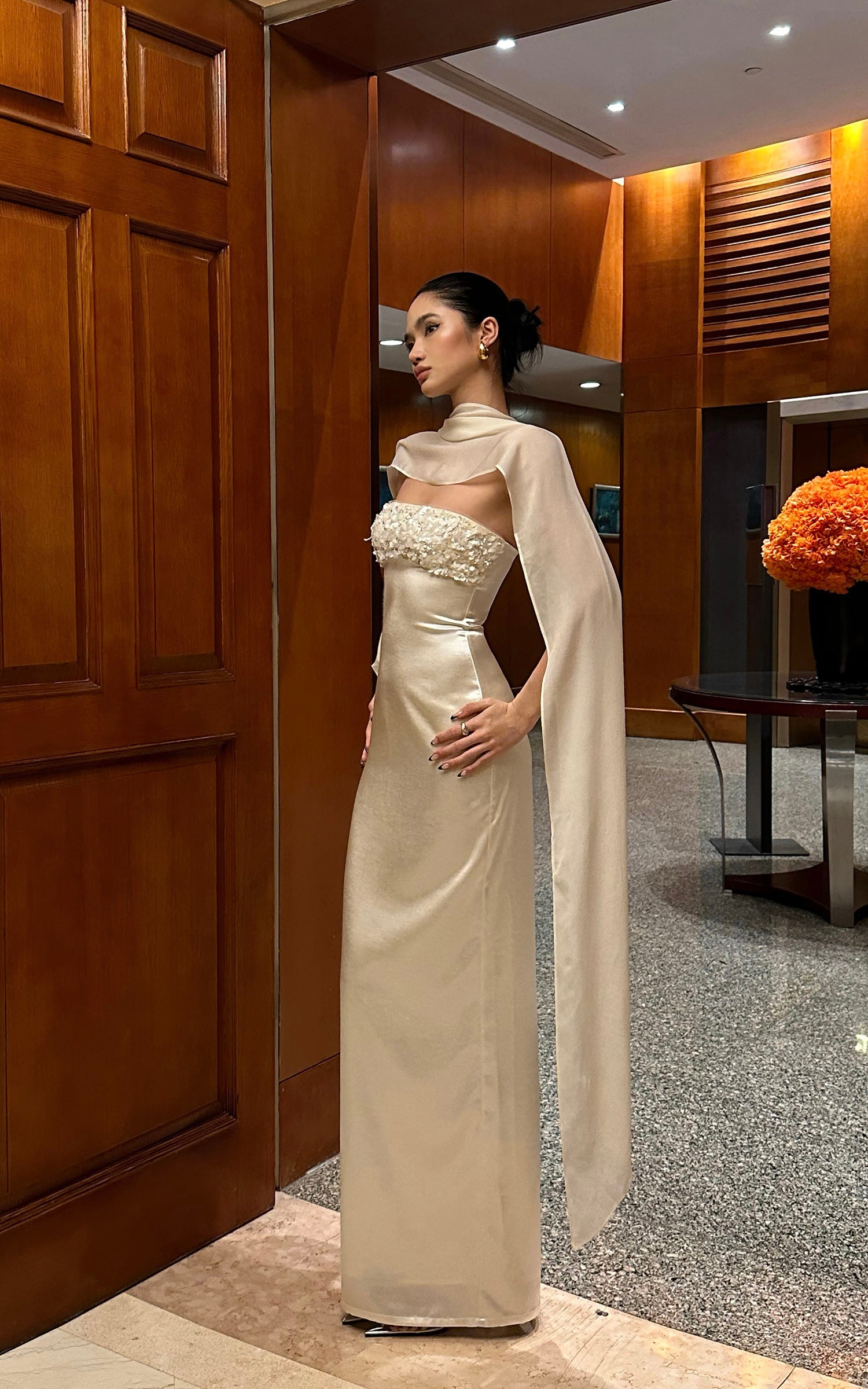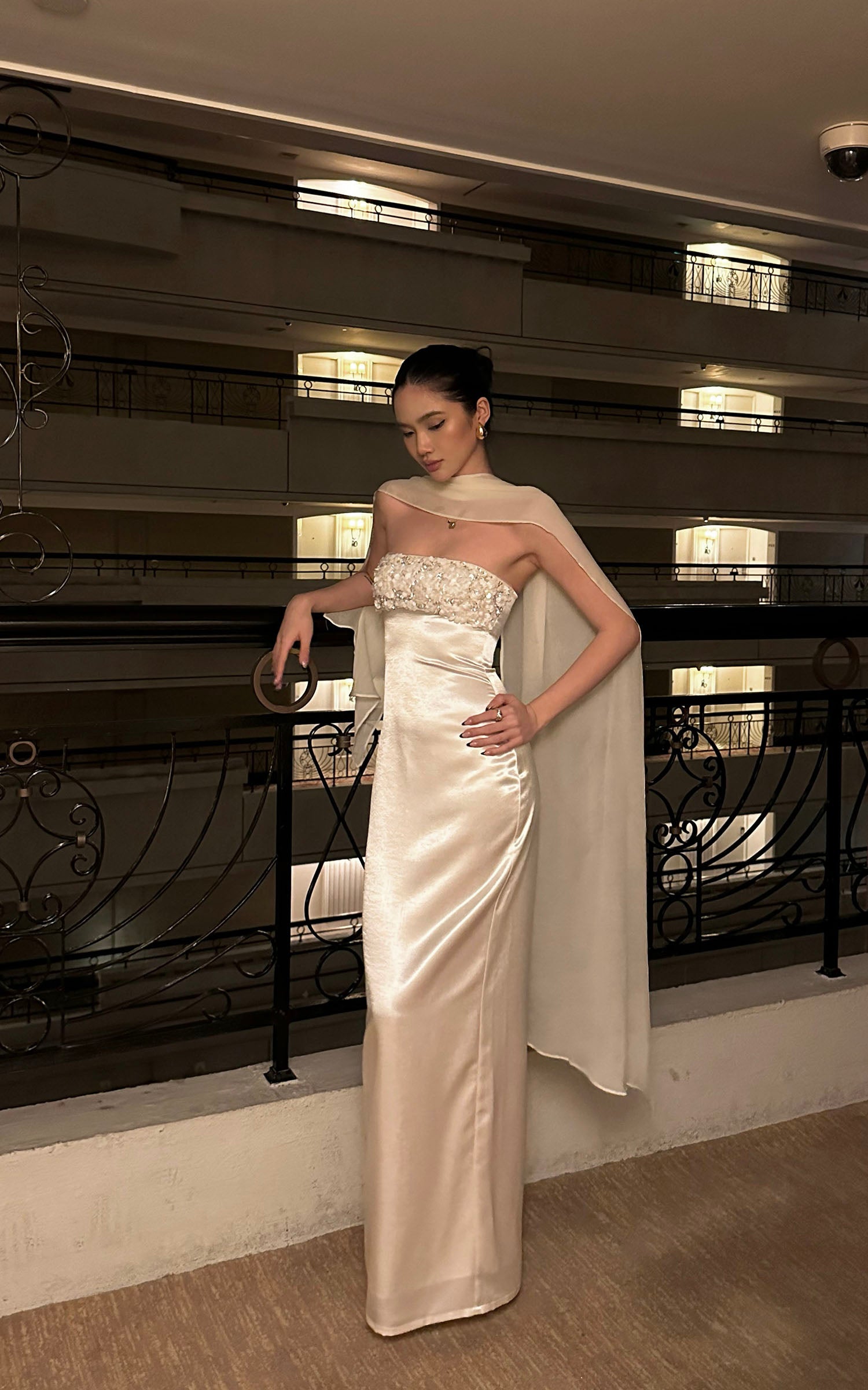 ROVENTE ドレープショールストラップレスマキシドレス