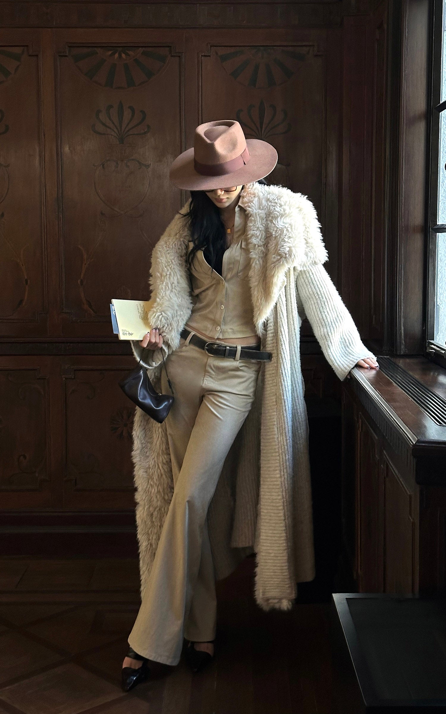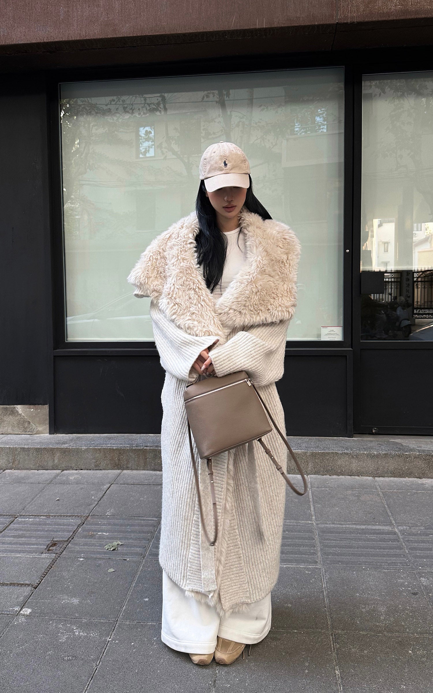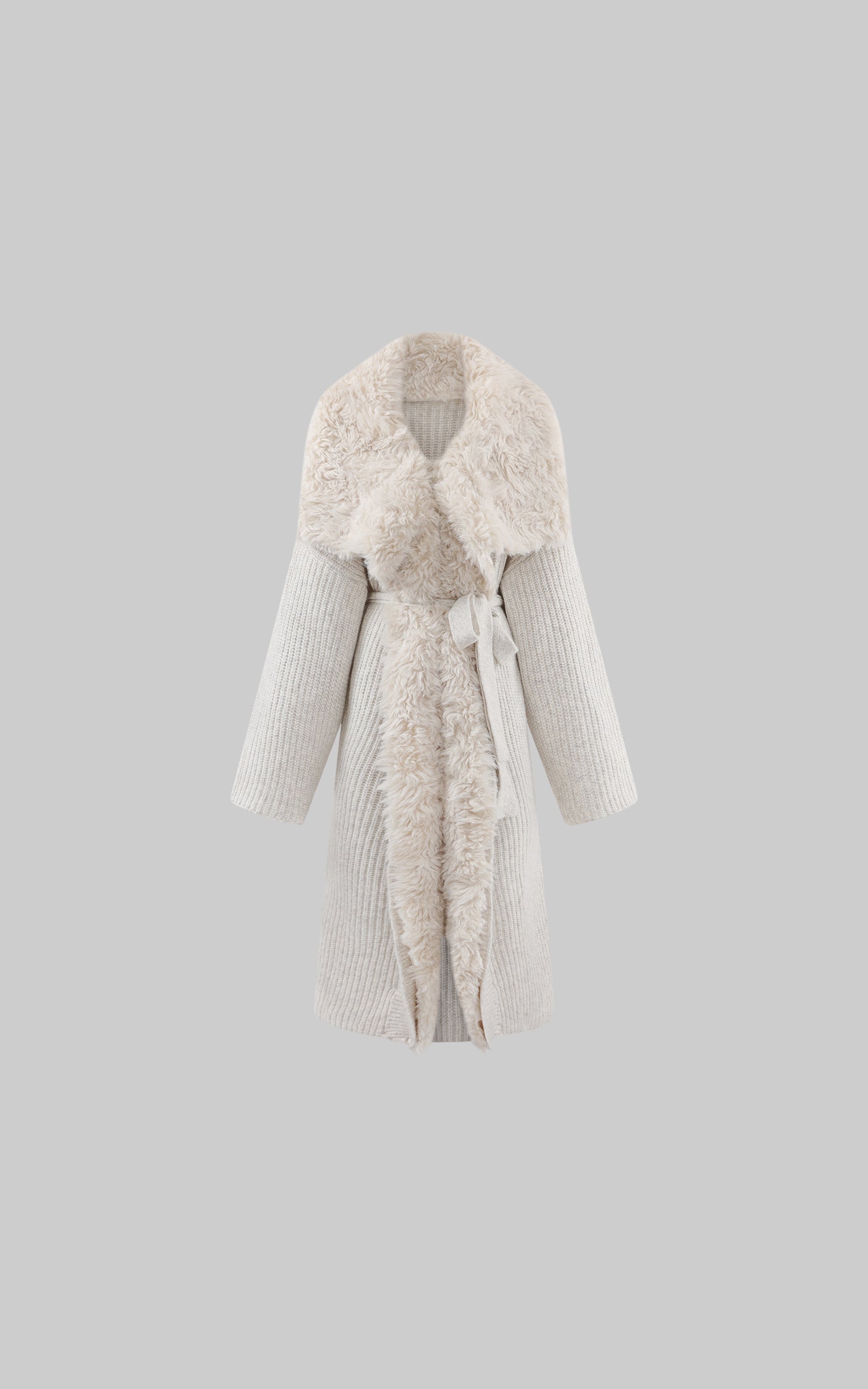 ROVENTE フェイクファー トリム ベルト付き ニット ロングコート