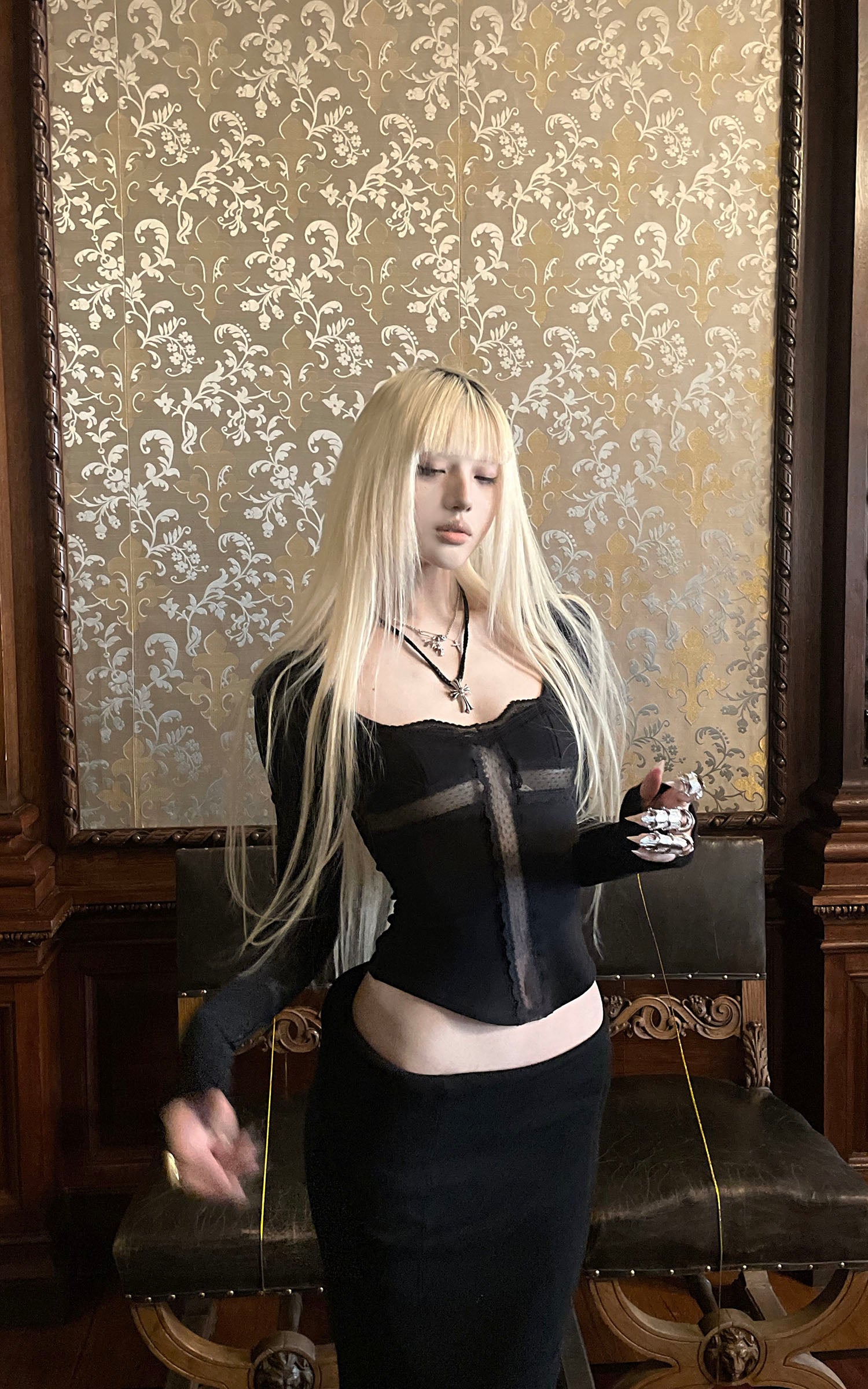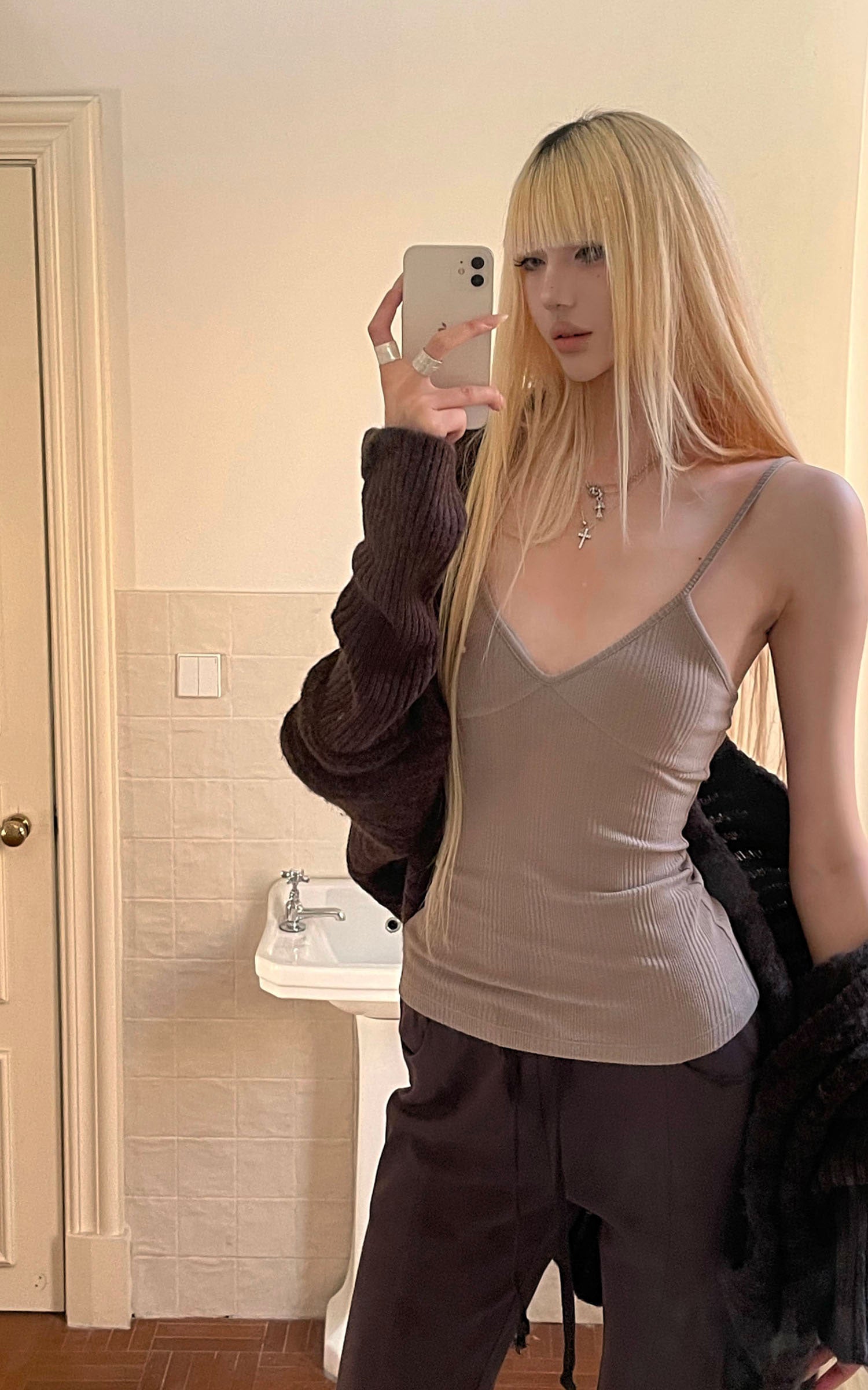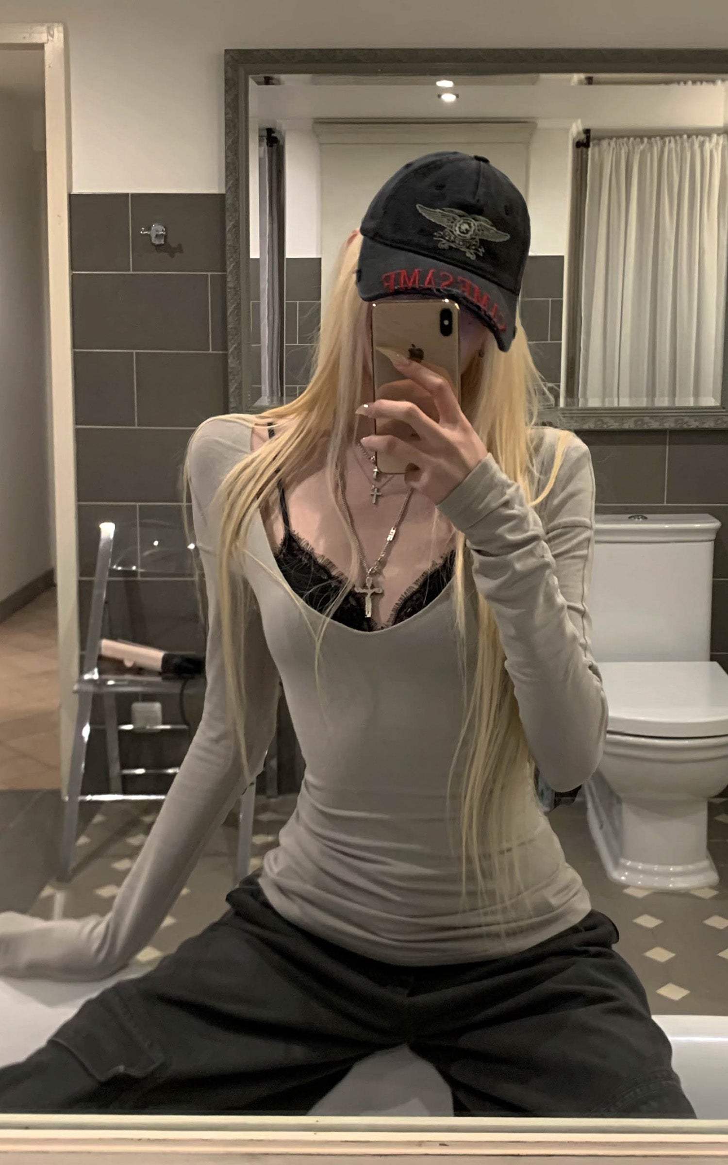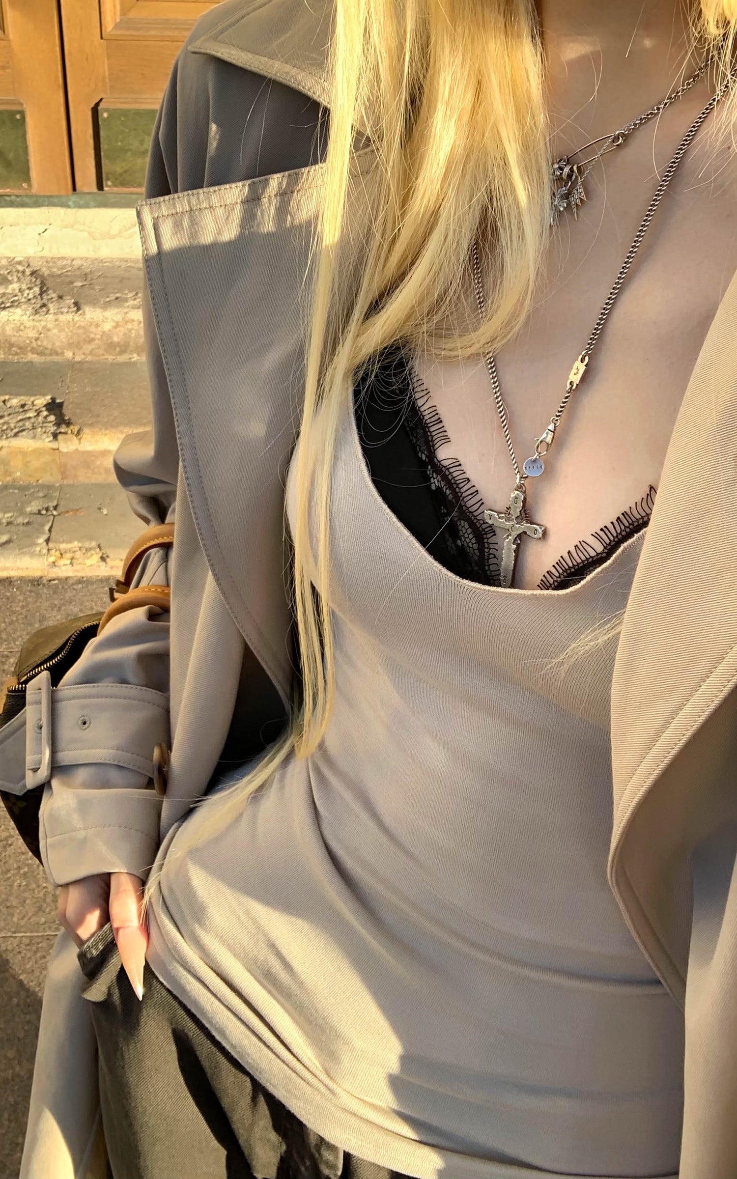 Rase le sol レーストリム付きリブ深Vネック長袖Tシャツとキャミソールセット