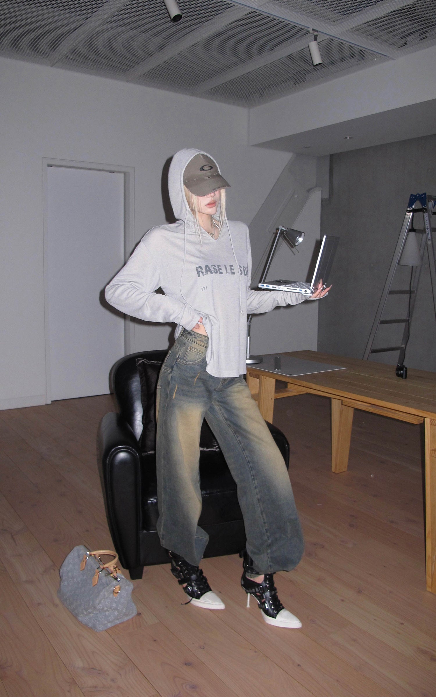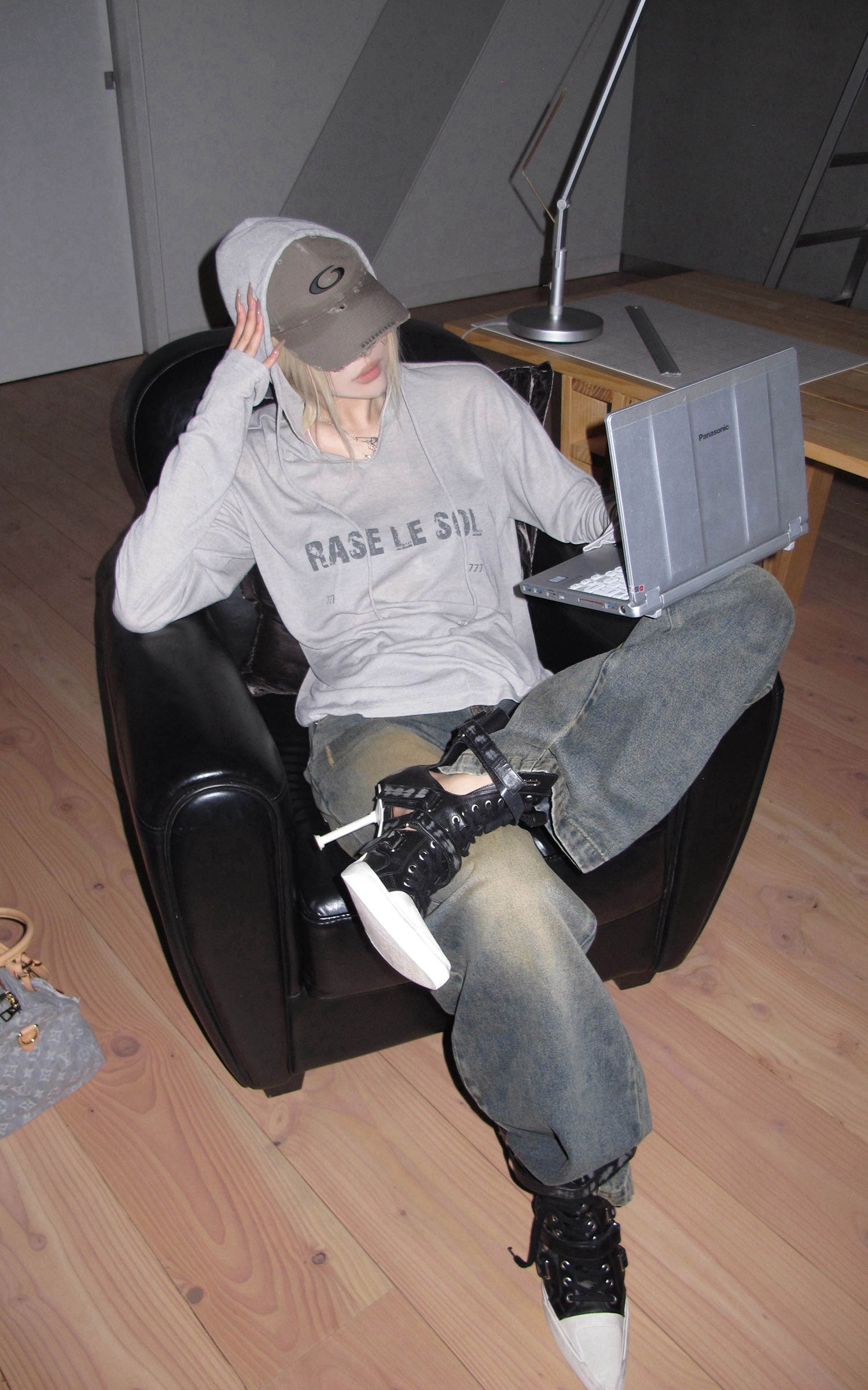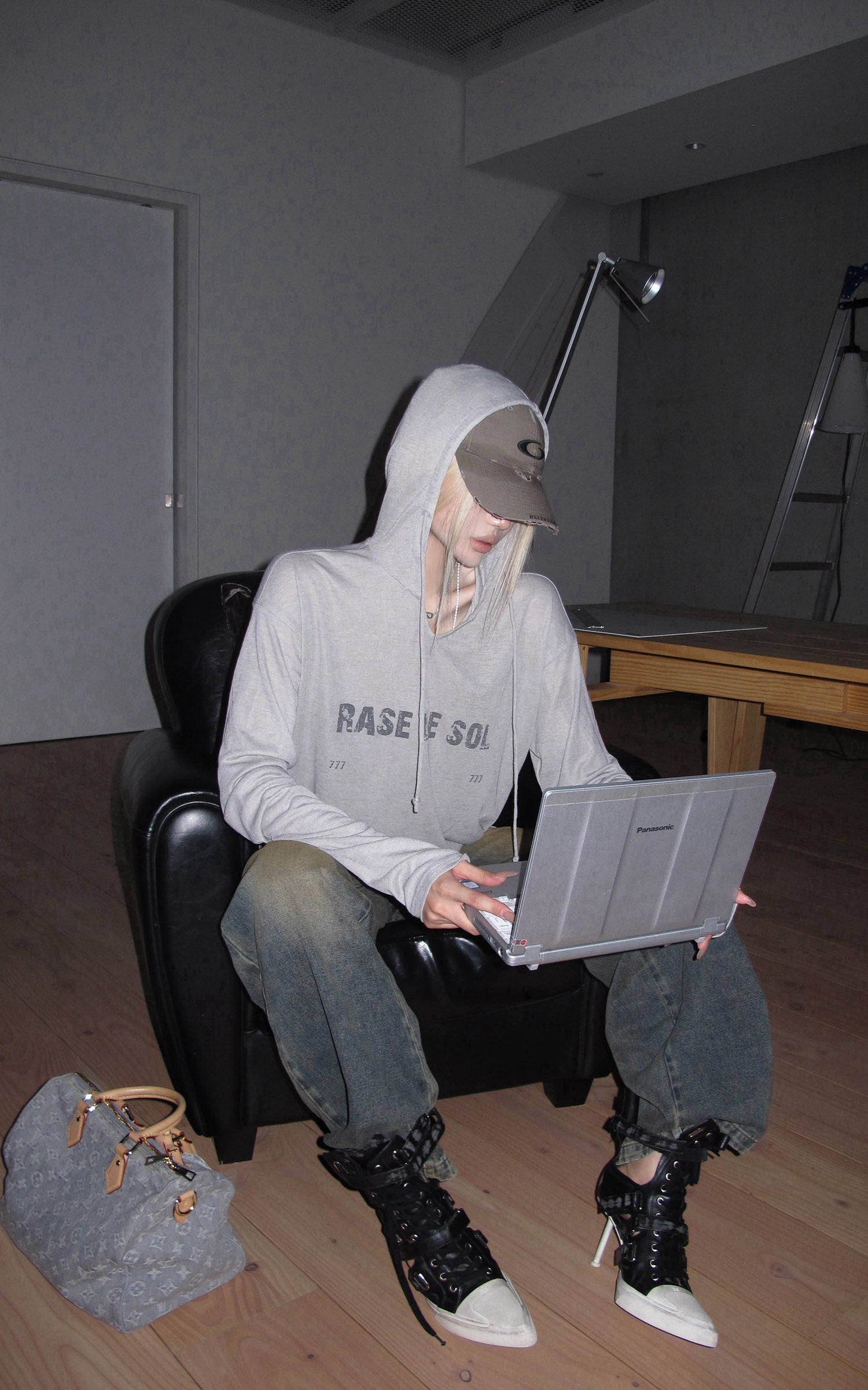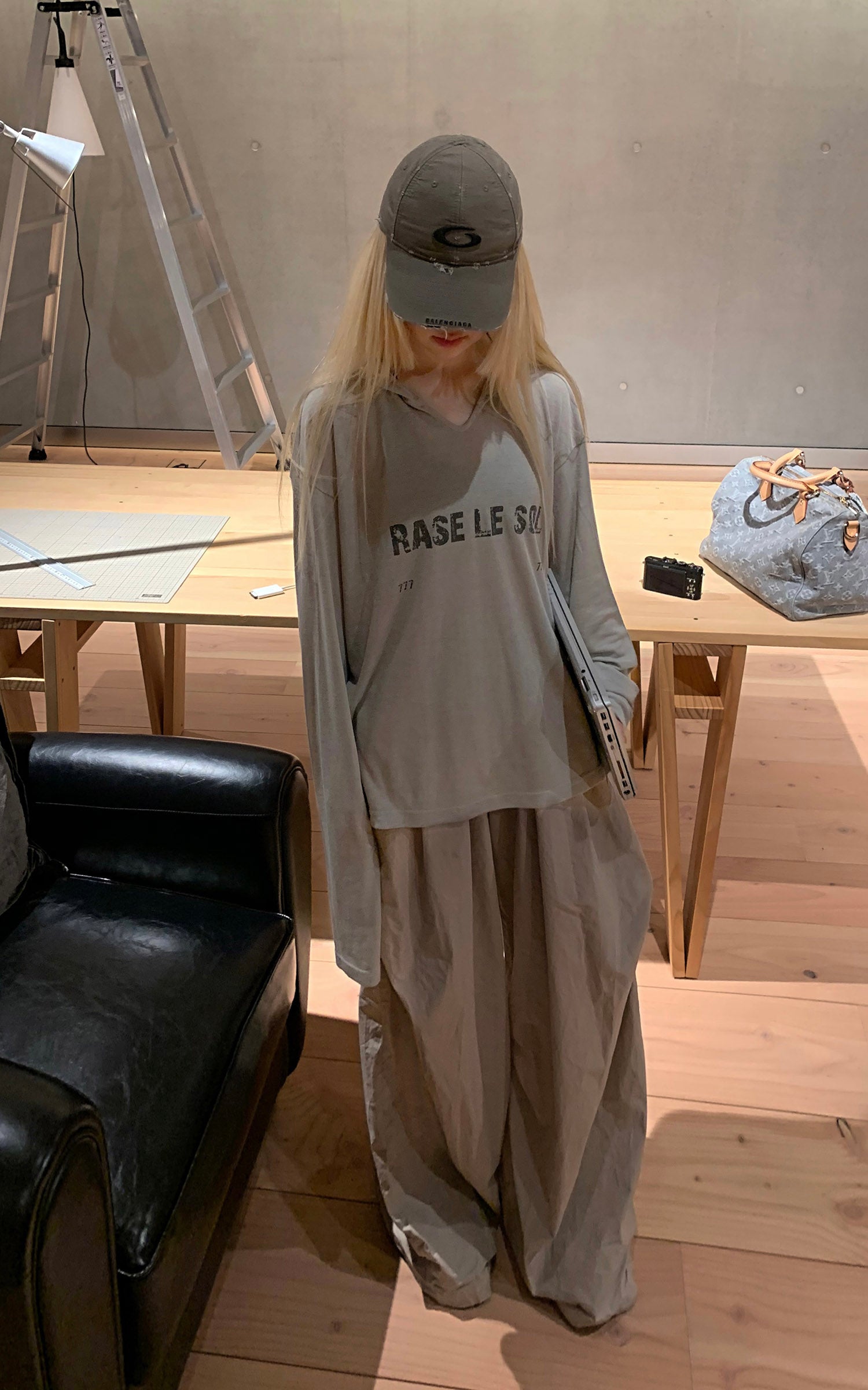 Rase le sol グレー フード付き プリント 長袖Tシャツ