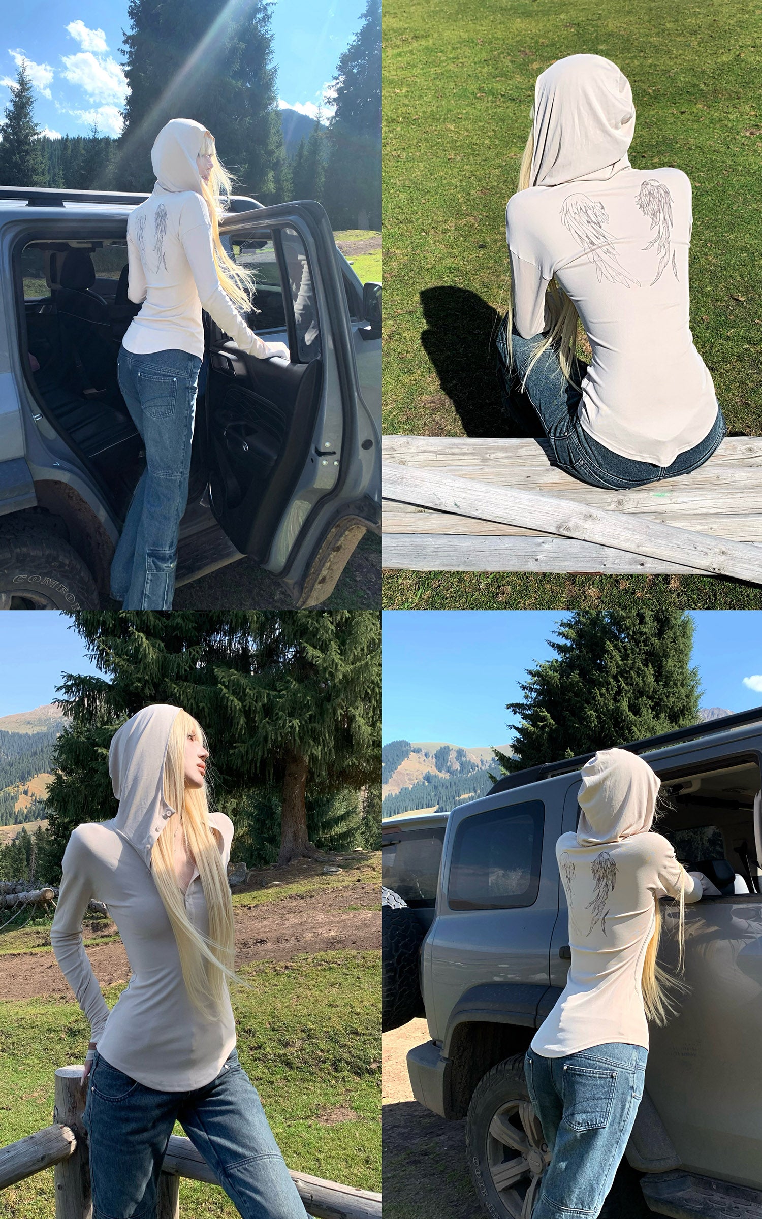 Rase le sol スケッチ風ウィングモチーフ付きフィット長袖フーディTシャツ