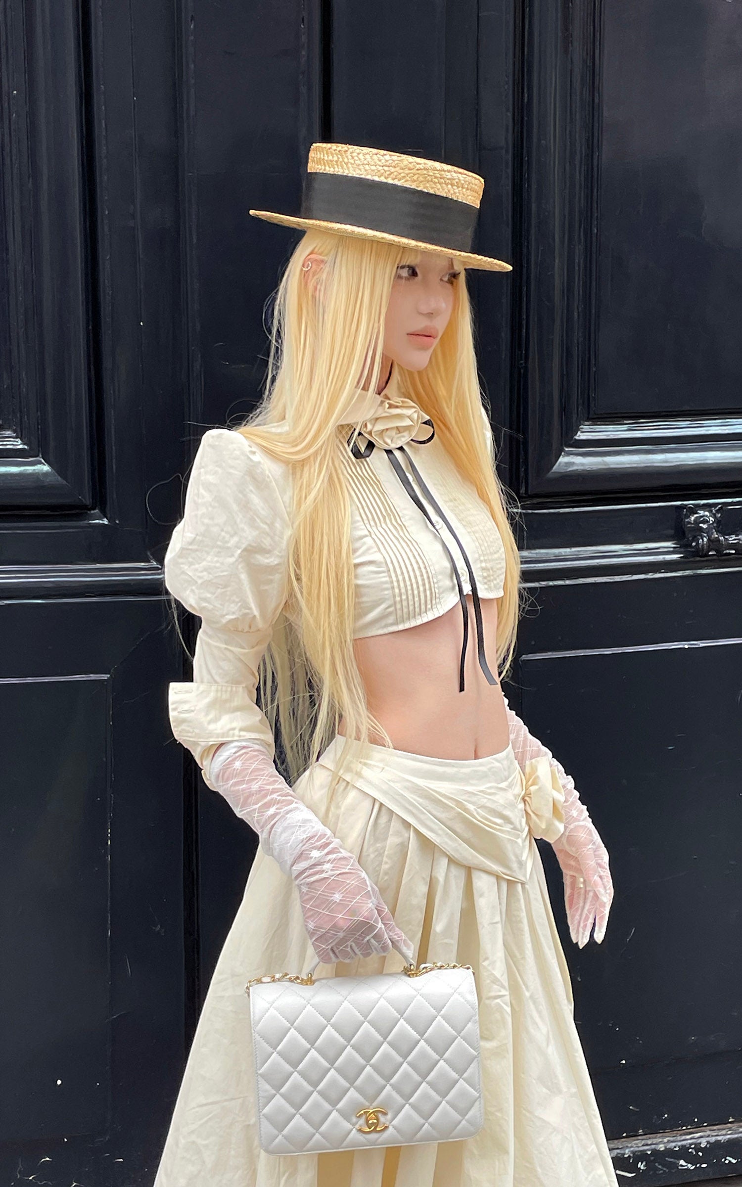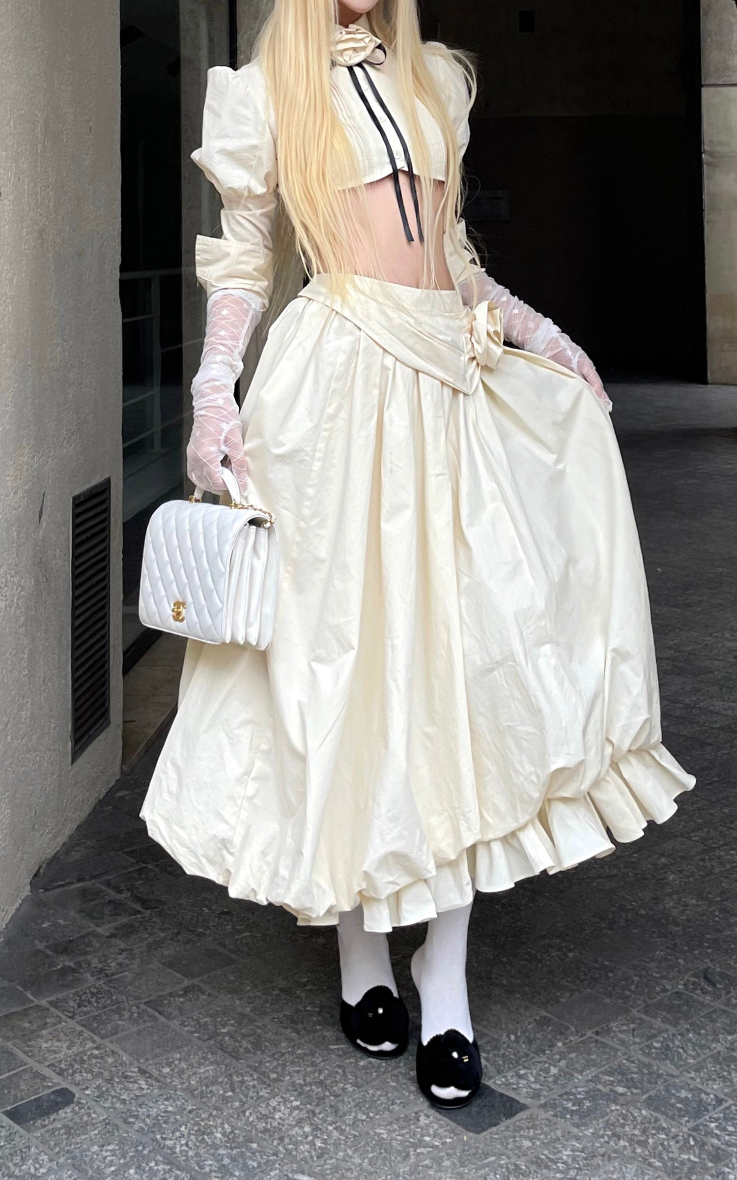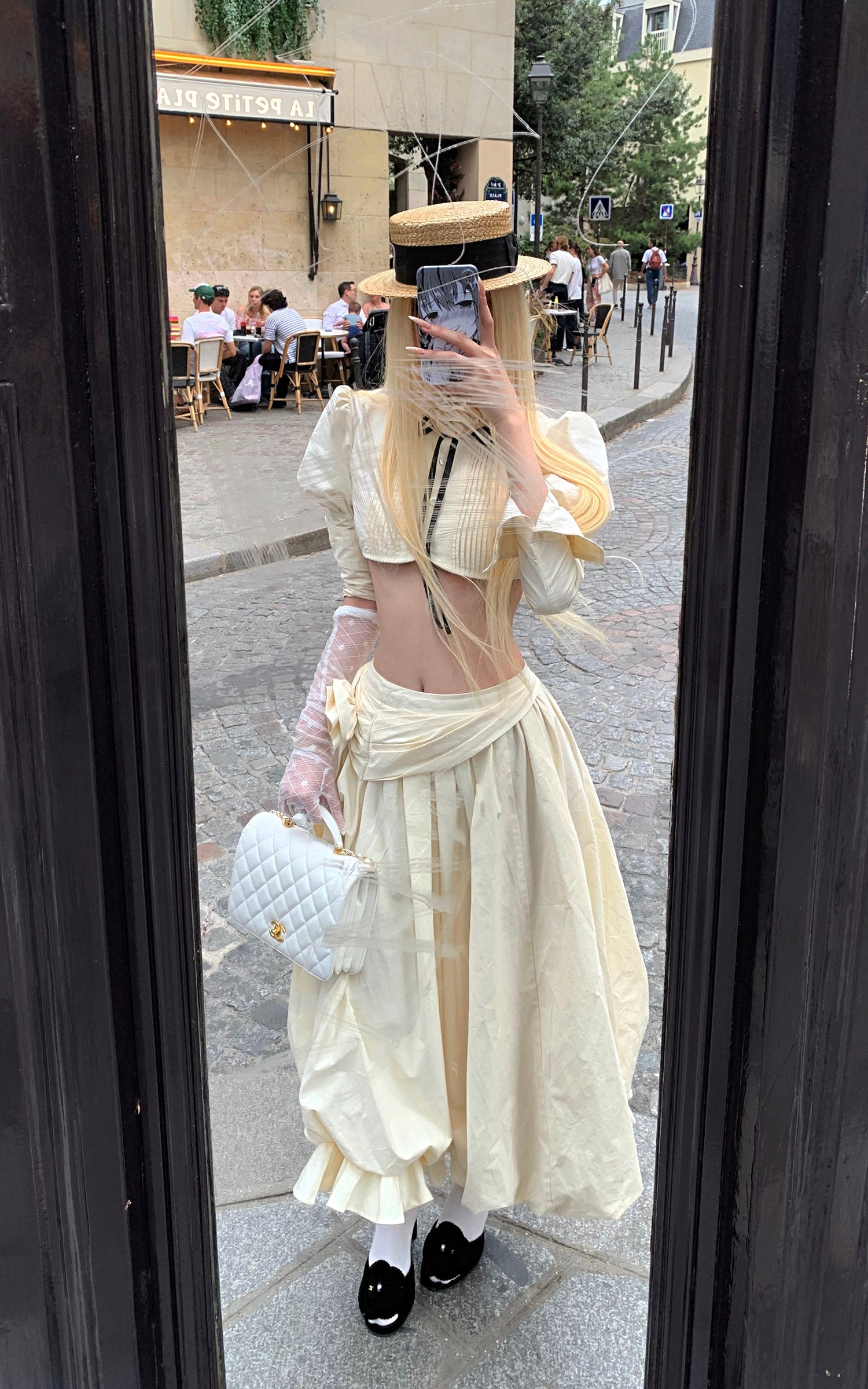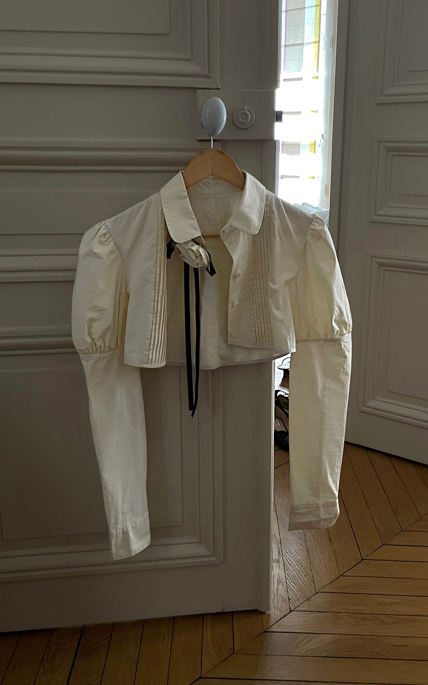 Rase le sol プリーツフロント&ロゼットタイ付きクロップドパフスリーブシャツ