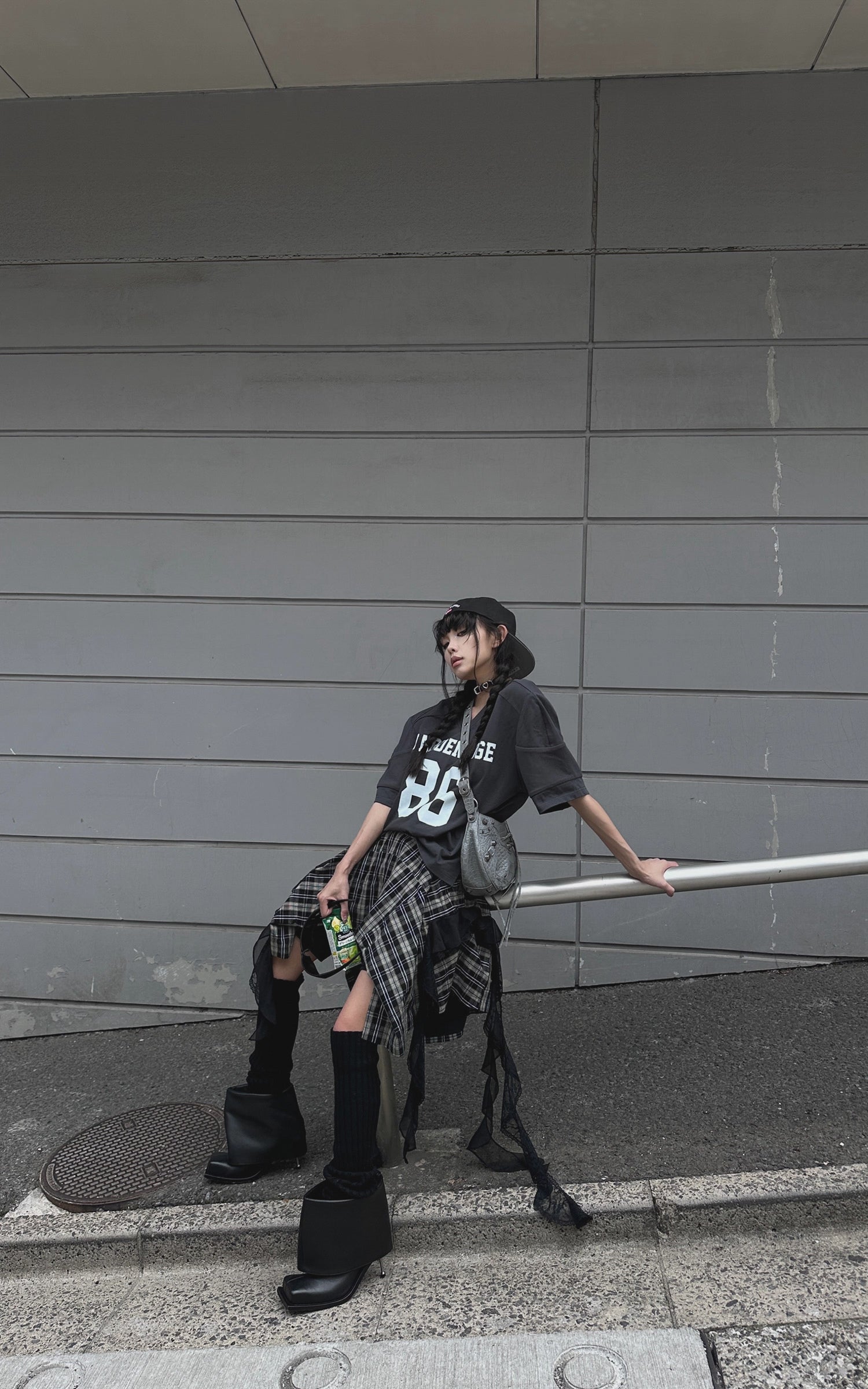 WARDEN EDGE Asymmetrical Plaid Skirt with Lace Paneling